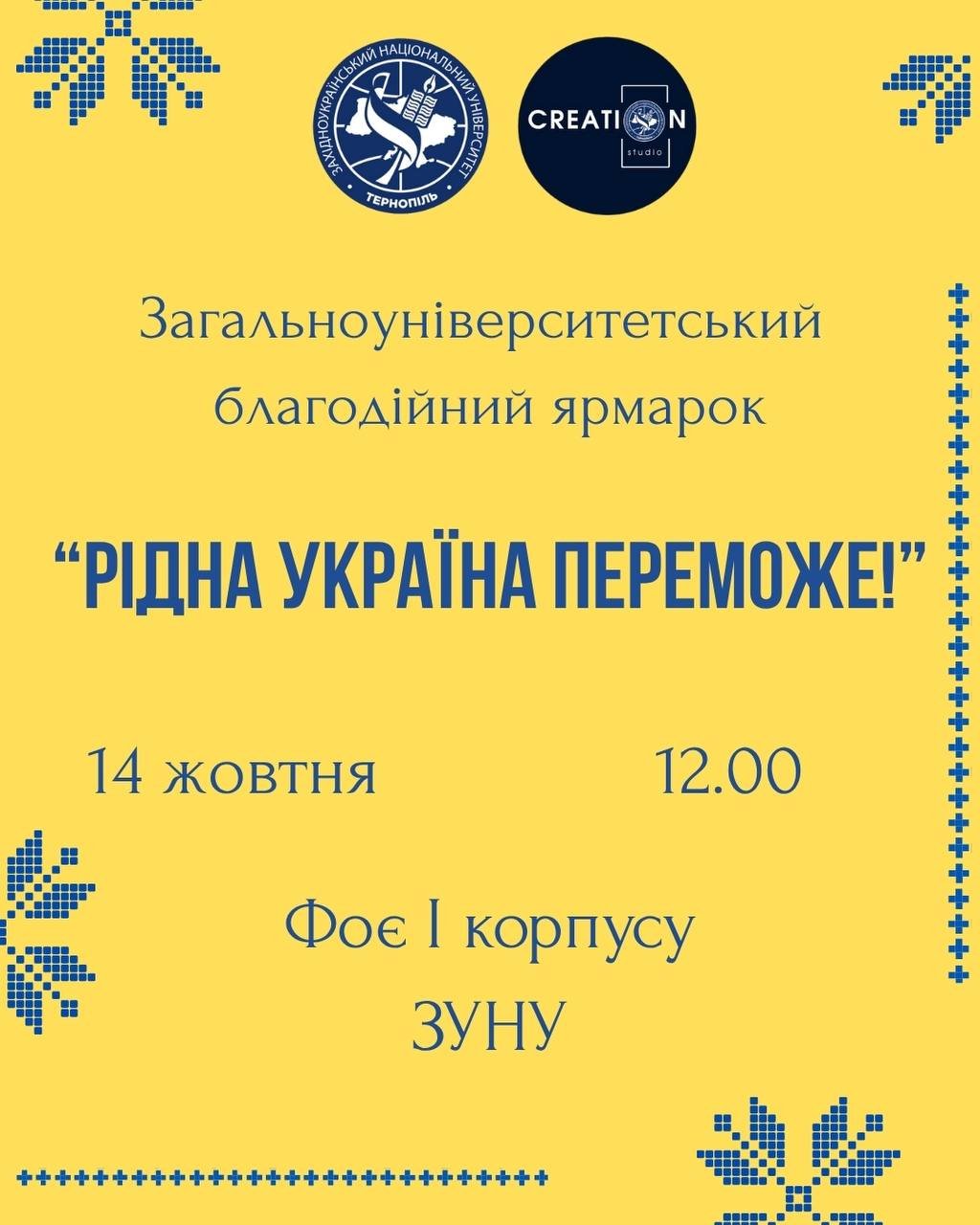 Колектив відділу творчої самореалізації та виховання ЗУНУ запрошує університетську спільноту долучитися до загальноуніверситетського благодійного ярмарку «Рідна Україна переможе!», який відбудеться 14 жовтня о 12:00 год у фоє головного корпусу ЗУНУ.