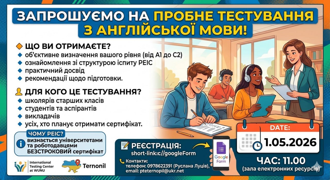 Запрошуємо на пробне тестування з визначення рівня володіння англійською мовою