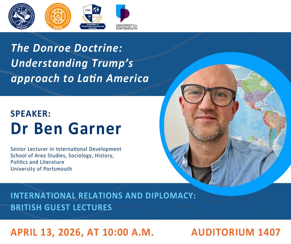 Within the framework of the educational platform “International Relations and Diplomacy: British Guest Lectures”, organized by the Department of International Relations and Diplomacy of the B. D. Havrylyshyn Educational and Scientific Institute of International Relations, we invite students, academic staff, and all interested participants to join a unique event – a lecture titled “The Donroe Doctrine: Understanding Trump’s Approach to Latin America.”
