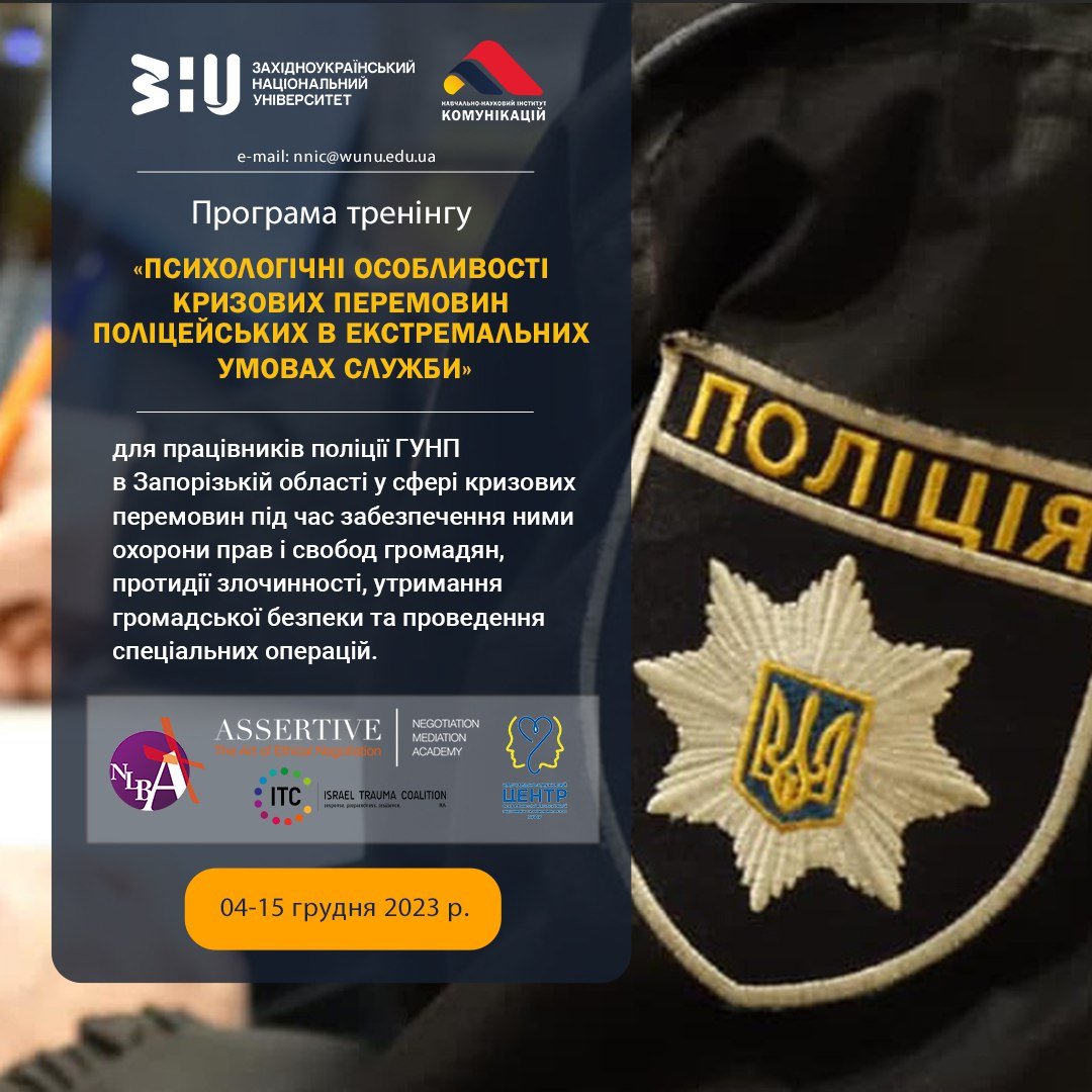 The Education and Research Institute of Communications of West Ukrainian National University will host a two-week training course on "Psychological Features of Crisis Negotiations for Police Officers in Extreme Conditions of Service". The target group will be police officers of the Zaporizhzhia Oblast Main Police Department. Training will focus on crisis negotiations in the course of ensuring the protection of citizens' rights and freedoms, combating crime, maintaining public safety and conducting special operations.