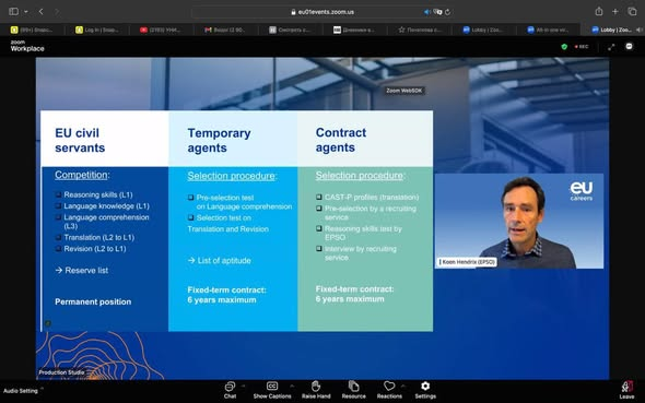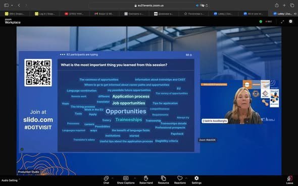 The event programme included an introductory presentation about DG Translation (in English) and virtual breakout rooms for each of the 24 official EU languages, as well as Ukrainian, where students could talk directly to translators and ask questions about their professional activities.