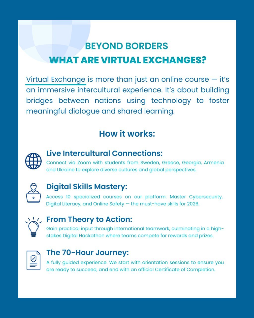 The programme aims to develop digital competencies, cybersecurity, intercultural dialogue and teamwork skills in an international online environment. It brings together participants from Sweden, Greece, Georgia, Armenia and Ukraine. The Digital Hackathon is an important part of the programme, during which participants will work on real digital challenges and practical cases.