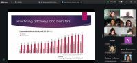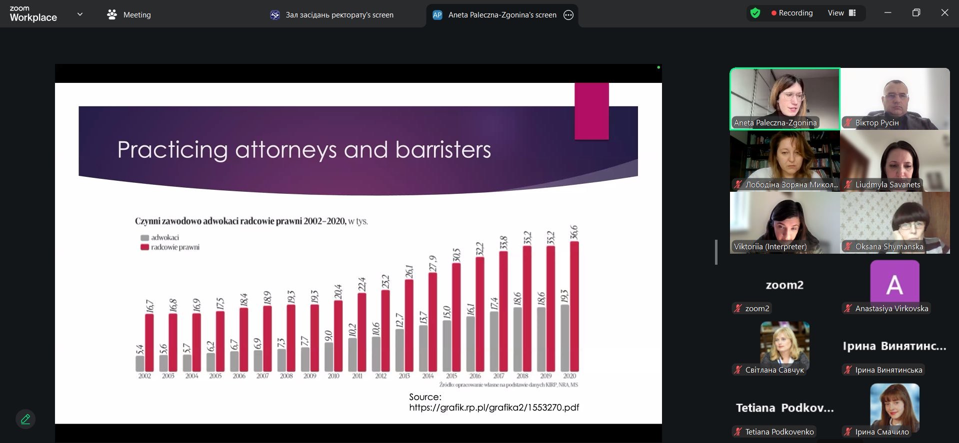 In her presentation, the lecturer paid special attention to the specifics of taking exams for the status of attorney, barrister, notary, prosecutor, and judge. In particular, they discussed the test format (150 questions) and the passing score (100 answers). The internship (application) format, which varies from 2 years (for bailiffs) to 3.5 years (for notaries). Regarding the authority of interns, the lecturer emphasised the possibility of representing parties in court after only 6 months of training for future lawyers.