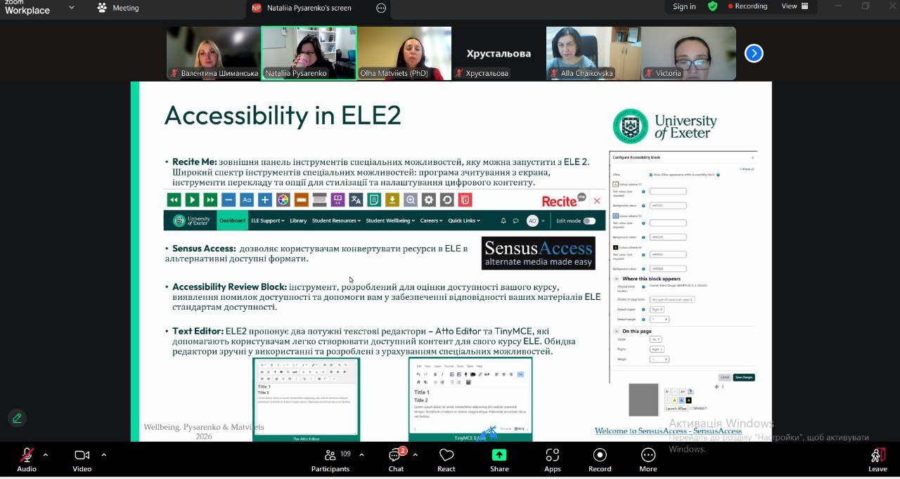 Over the course of two weeks, employees of the WUNU Student Support Centre took part in a series of online events aimed at improving professional skills and enhancing inclusive interaction practices in the educational environment. In particular, the Centre's specialists participated in the webinar "Caring for Students and Inclusiveness. The Experience of British Universities," during which modern approaches of British universities to providing student support, creating an inclusive educational setting, and implementing effective models of student support were presented.