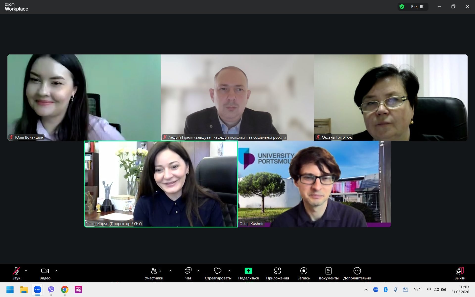 An online meeting was recently held to discuss the expansion of international academic cooperation with the University of Portsmouth (UK). The meeting was attended by Uliana Koruts, Vice-Rector for Academic Affairs and Research, Oksana Homotiuk, Dean of the Faculty of Social Sciences and Humanities; Andrii Hirniak, Head of the Department of Psychology and Social Work at WUNU; Yuliia Palaniuk, Head of WUNU's International Relations Office; and Ostap Kushnir, the official representative of the British university.