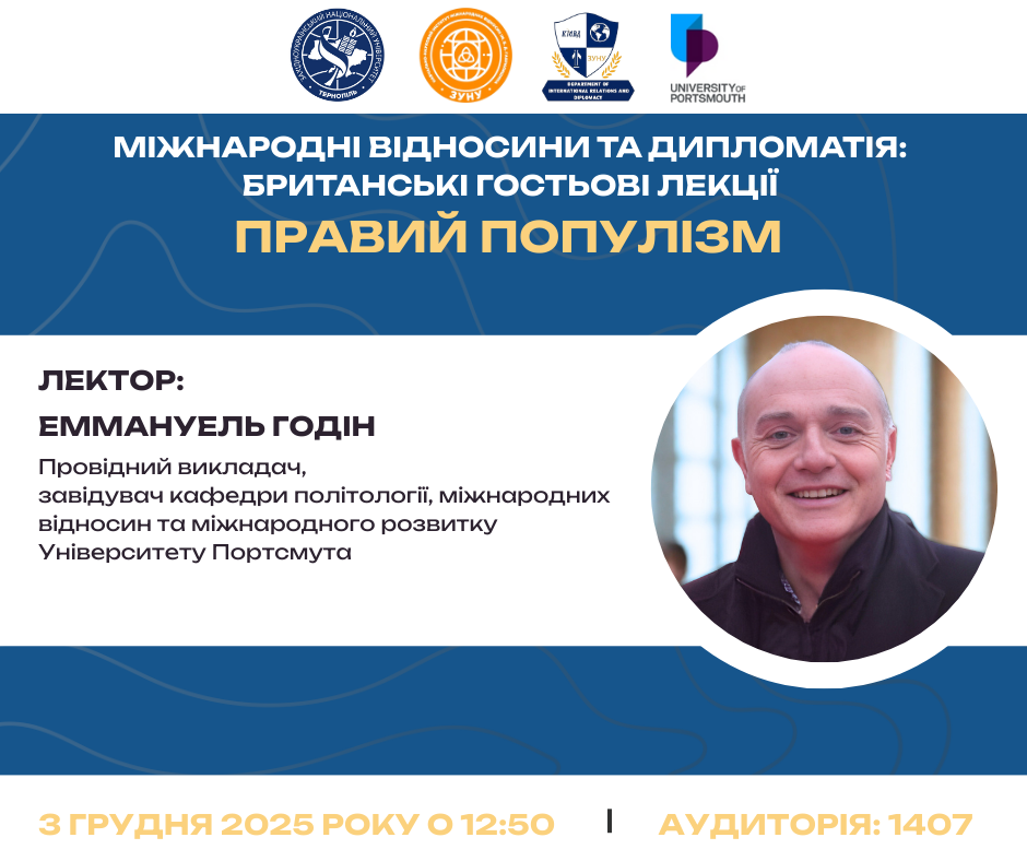 У межах освітньої платформи «Міжнародні відносини та дипломатія: британські гостьові лекції», що реалізується кафедрою міжнародних відносин та дипломатії навчально-наукового інституту міжнародних відносин ім. Б. Д. Гаврилишина за сприяння проректора з науково-педагогічної роботи ЗУНУ, професора Уляни Коруц та відділу міжнародних зв’язків, запрошуємо здобувачів, викладачів та всіх охочих на лекцію-тренінг «Правий популізм».