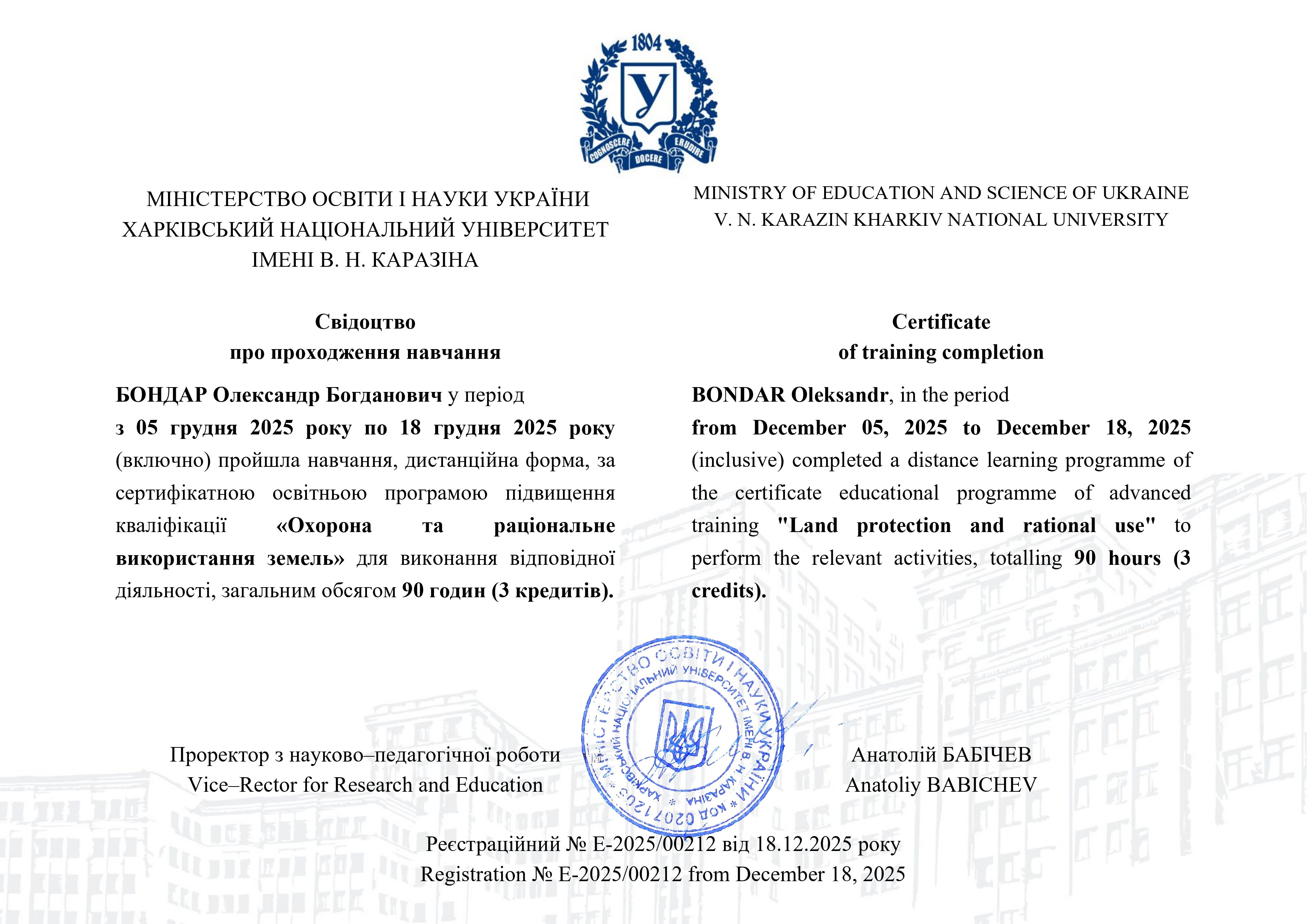 У період з 05 по 18 грудня 2025 року Олександр Бондар, доцент кафедри екології та охорони здоров'я ЗУНУ, успішно завершив навчання за сертифікатною програмою підвищення кваліфікації на тему «Охорона та раціональне використання земель».