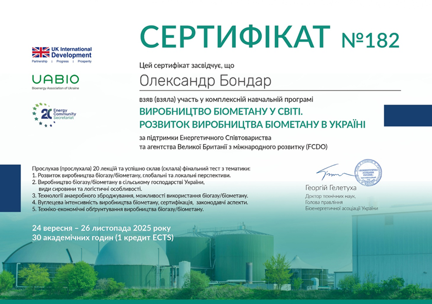Доцент кафедри екології та охорони здоров'я Західноукраїнського національного університету Олександр Бондар успішно завершив комплексну навчальну програму «Виробництво біометану у світі. Розвиток виробництва біометану в Україні» та отримав сертифікат, що підтверджує його високий рівень кваліфікації в галузі біоенергетики.