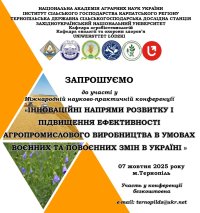 Колективи кафедр агробіотехнологій й екології та охорони здоров’я ЗУНУ запрошують взяти участь у міжнародній науково-практичній конференції «Інноваційні напрями розвитку і підвищення ефективності агропромислового виробництва в умовах воєнних та повоєнних змін в Україні», яка відбудеться 7 жовтня 2025 року на базі Тернопільської державної сільськогосподарської досмлідної станції Інституту сільського господарства Карпатського регіону НААН, вул. Тролейбусна, 12, м. Тернопіль, 46027.