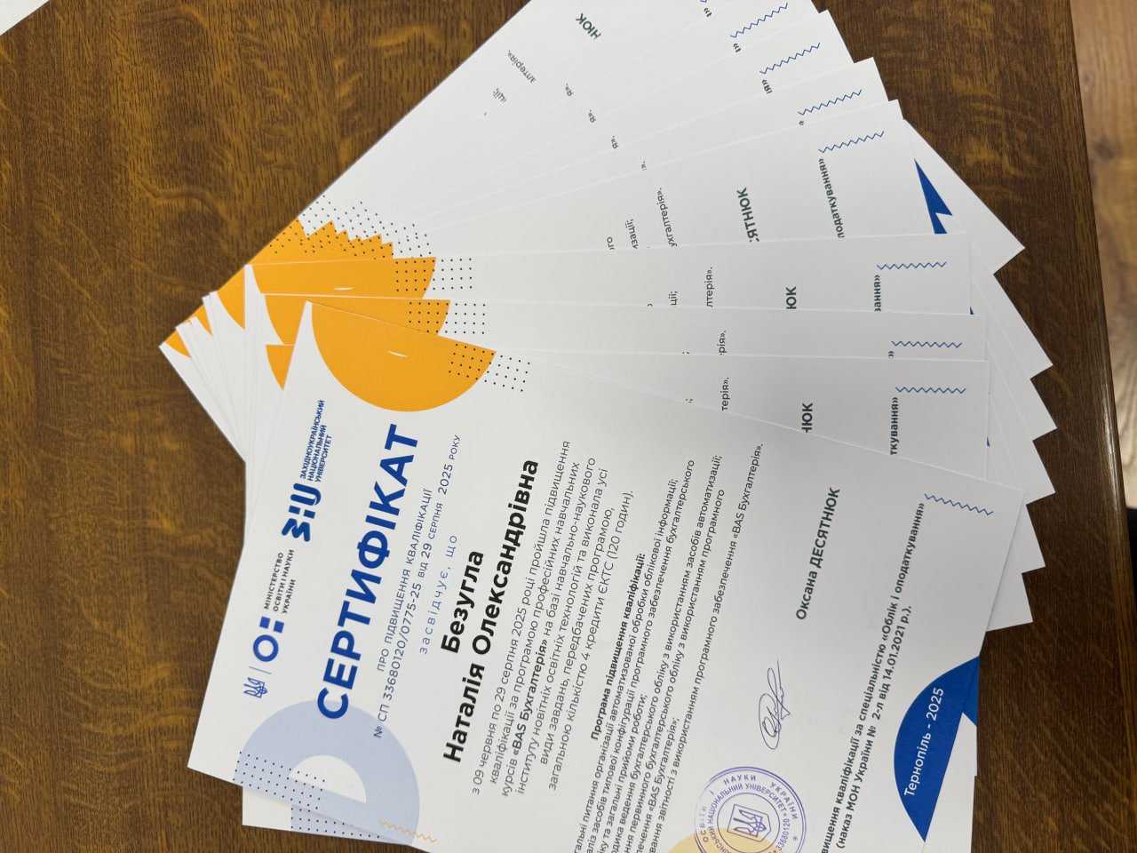 На замовлення Тернопільської обласної організації Товариства Червоного Хреста України, у межах проєкту «Перезавантаження: розширення можливостей для працевлаштування», який має на меті допомогти внутрішньо переміщеним особам та місцевим з числа вразливих категорій населення адаптуватися та закріпитися на місцевому ринку праці, відбулося вручення сертифікатів про підвищення кваліфікації слухачам за програмою професійних навчальних курсів «BAS Бухгалтерія» на базі навчально-наукового інституту новітніх освітніх технологій Західноукраїнського національного університету.