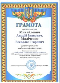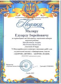 Керівник студентів — Едуард Імреійович Маляр — відзначений подякою за фахову підготовку та підтримку молодих науковців.