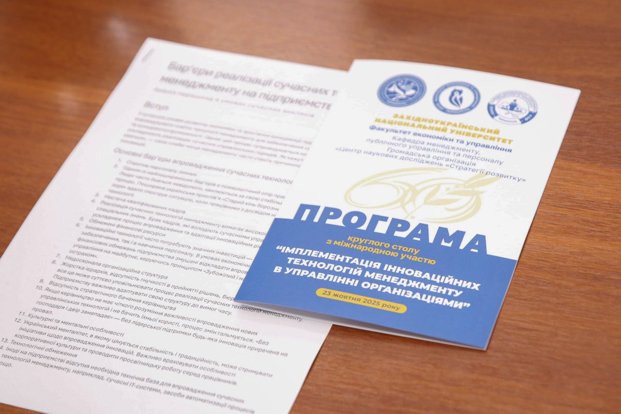 За ініціативи кафедри менеджменту, публічного управління та персоналу у Західноукраїнському національному університеті відбувся круглий стіл «Імплементація інноваційних технологій менеджменту в управлінні організаціями», який проводився з метою обговорення актуальних проблем, тенденцій і перспектив впровадження інноваційних технологій менеджменту в систему управління сучасними організаціями; узагальнення кращих управлінських практик, обміну досвідом та напрацювання спільних підходів науковцями, управлінцями, представниками бізнесу, влади та громадського сектору щодо підвищення ефективності управління організаціями в умовах динамічних перетворень та викликів сьогодення.