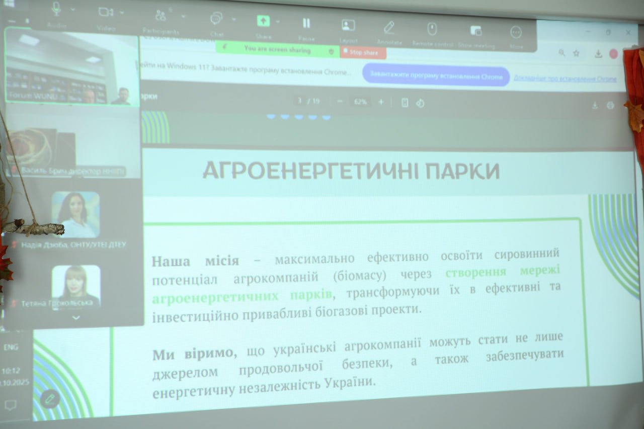 Під час заходу фахівці у сфері агрономії, біоенергетики та екології представили практичні рішення щодо пом’якшення наслідків зміни клімату та їх роль в інноваційному розвитку аграрного природокористування. Власні напрацювання презентували: заступниця директора департаменту – начальниця управління житлово-комунального господарства та енергозбереження Тернопільської обласної військової адміністрації Софія Близнюк; д-р техн. наук, професор, голова правління ГС «Біоенергетична асоціація України» Георгій Гелетуха; заступник начальника управління екології та природних ресурсів Тернопільської обласної військової адміністрації Ігор Пятківський;, директорка Агенції регіонального розвитку в Тернопільській області Ірина Скуратко; голова правління ГС «Агроенергетичні парки України» Костянтин Орловський; завідувач сектору з енергоефективності Управління житлово-комунального господарства, благоустрою та екології Тернопільської міської ради Павло Савечко; координатор ініціативи Cluster4Regions Українського кластерного альянсу у Тернопільській області Ольга Лучка; канд. екон. наук, завідувач кафедри екології та охорони здоров’я ЗУНУ Леонід Бицюра; д-р с.-г. наук, професор, завідувач кафедри агробіотехнологій ЗУНУ Антін Шувар; к. с.-г. наук, доцент кафедри агробіотехнологій ЗУНУ – Віра Мороз.