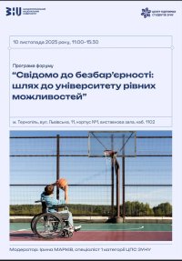 Запрошуємо Вас взяти участь у форумі «Свідомо до безбар’єрності: крок до університету рівних можливостей», який відбудеться 10 листопада 2025 року за адресою: м. Тернопіль, вул. Львівська, 11, корпус №1, Виставкова зала, каб. 1102. Початок об 11:00 год.