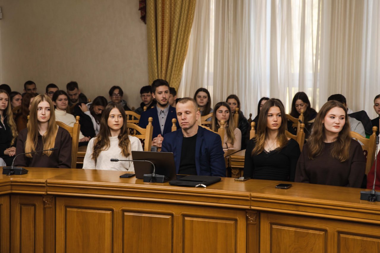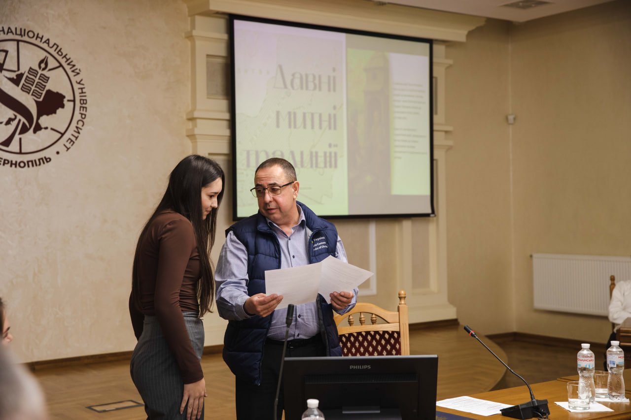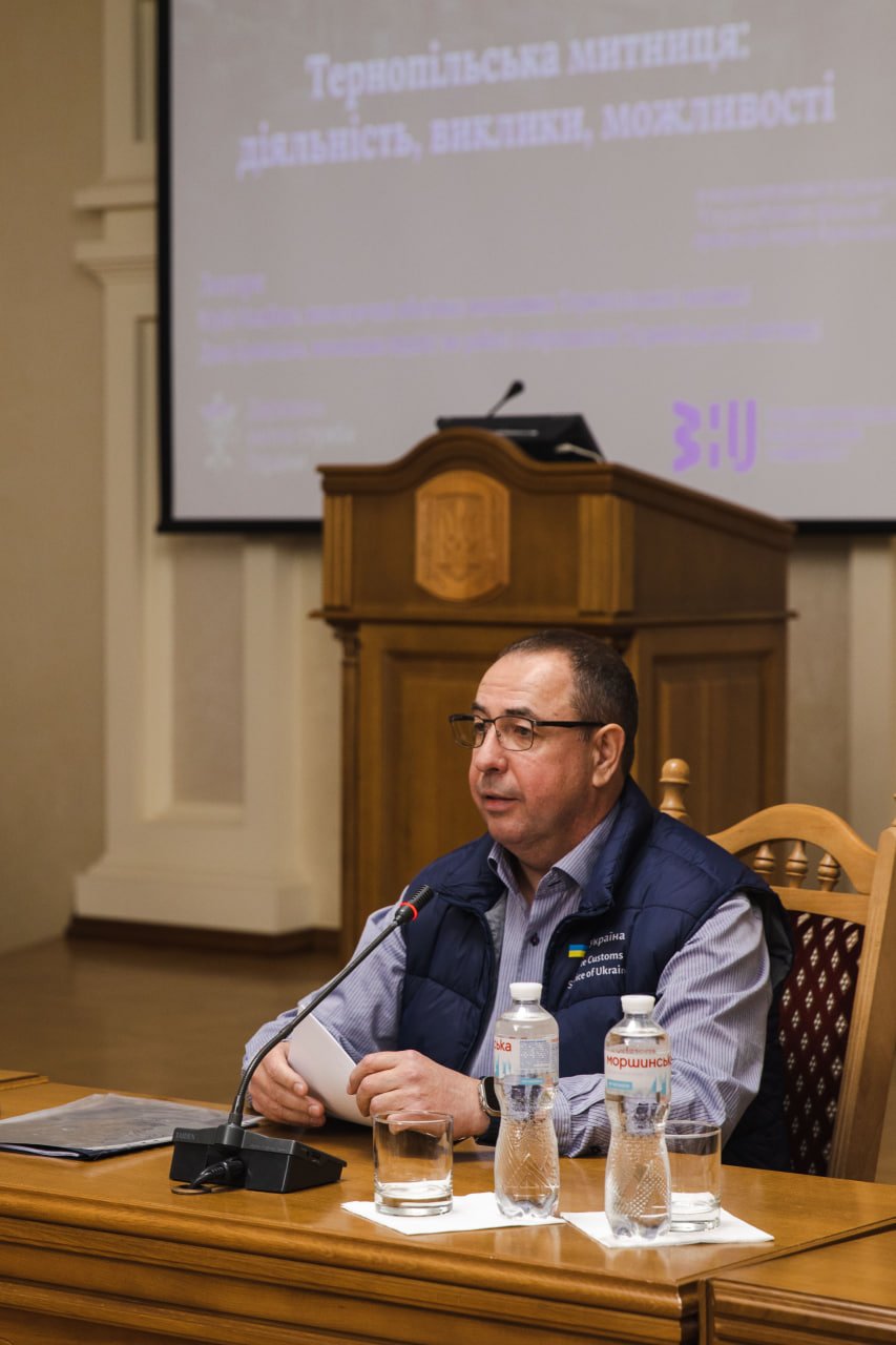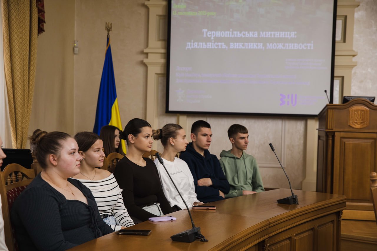 У ході лекції Юрій Ігорович Мацібора, виконувач обов’язків начальника Тернопільської митниці, представив змістовну доповідь, у якій розкрив історію становлення митниці, її сучасну структуру, здобутки та стратегічні орієнтири. Особливий акцент він зробив на спрощенні взаємодії з бізнесом, що є одним із ключових пріоритетів у роботі Тернопільської митниці. Спікер детально розповів про удосконалення митних процедур у контексті цифровізації, протидію контрабанді та порушенням митних правил, а також розвиток міжнародного партнерства.