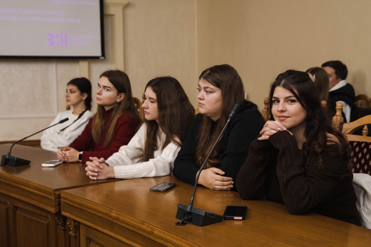 Другу частину зустрічі продовжила Дана Володимирівна Кривецька, начальниця відділу по роботі з персоналом Тернопільської митниці. Вона презентувала HR-стратегію Державної митної служби України на 2025–2030 роки, яка визначає пріоритети розвитку кадрового потенціалу, підвищення рівня професійної компетентності працівників та створення сучасної системи управління персоналом. Крім того, спікерка запросила студентів взяти участь у всеукраїнському конкурсі «Код митника», спрямованому на розвиток практичних навичок молоді та популяризацію професії митника серед студентської спільноти.