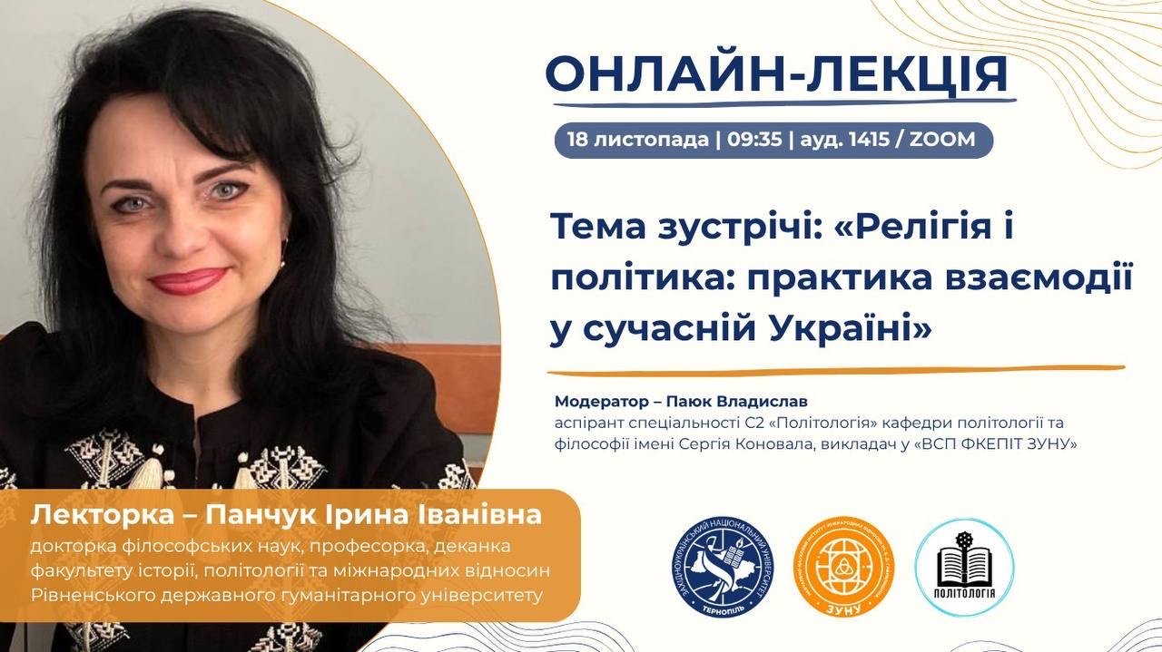 У межах роботи клубу «Софія» відбулася відкрита лекція, організована аспірантом ІІ року навчання спеціальності С2 «Політологія» Владиславом Паюком. Запрошена лекторка - Панчук Ірина Іванівна, доктор філософських наук, професор, декан факультету історії, політології та міжнародних відносин Рівненського державного гуманітарного університету. Говорили про релігію і політику: практику взаємодії у сучасній Україні.