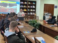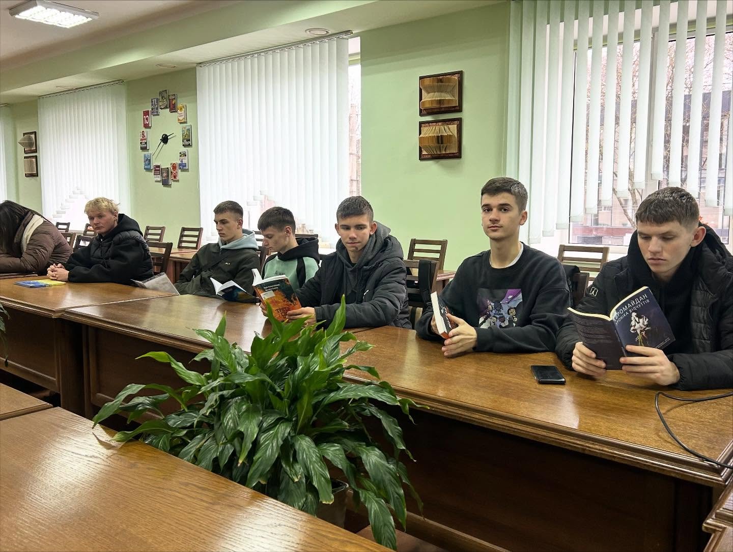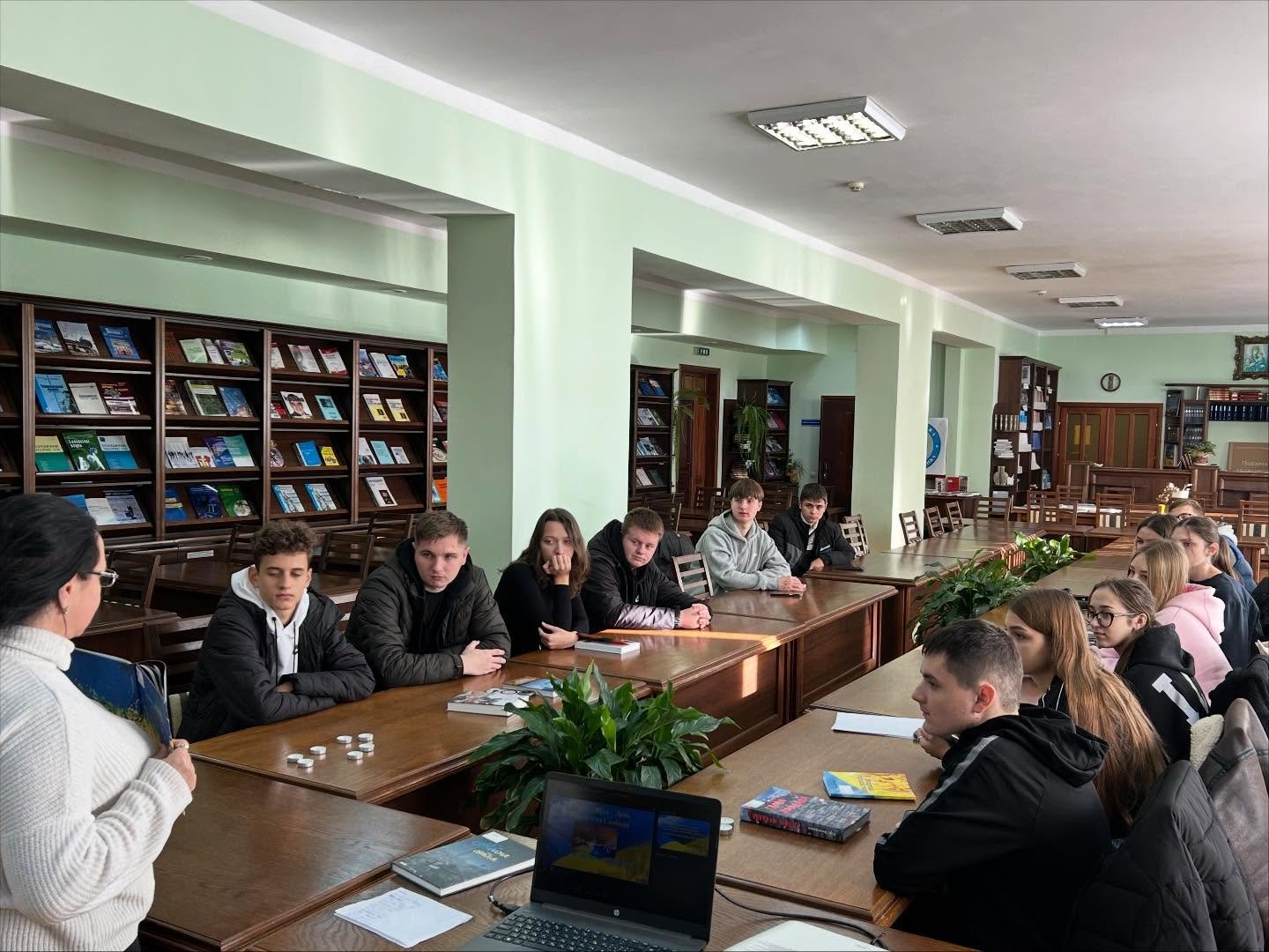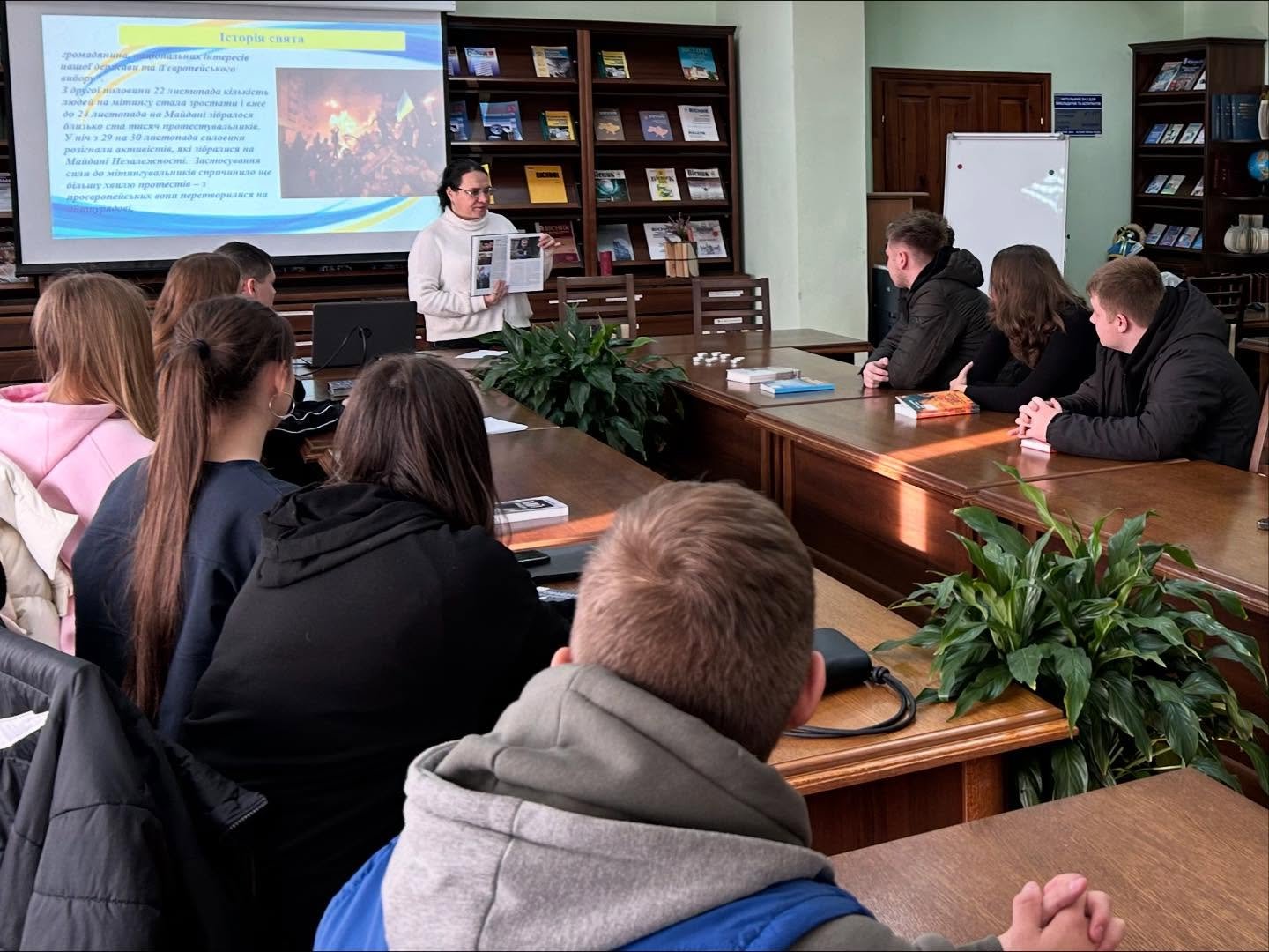 Завідувачка читального залу Ірина Любезна пригадала ключові події новітньої історії України – Революцію на граніті, Помаранчеву революцію та Революцію Гідності. А також презентувала книжкову виставку «Гідність і свобода: сторінки боротьби», де представлено історичні та документальні видання, спогади очевидців, публіцистику й художні твори, що відображають прагнення українців до свободи та утвердження гідності. Виставка стала важливим доповненням бесіди, дозволивши студентам глибше зануритися у тему та відкрити для себе нові джерела знань.