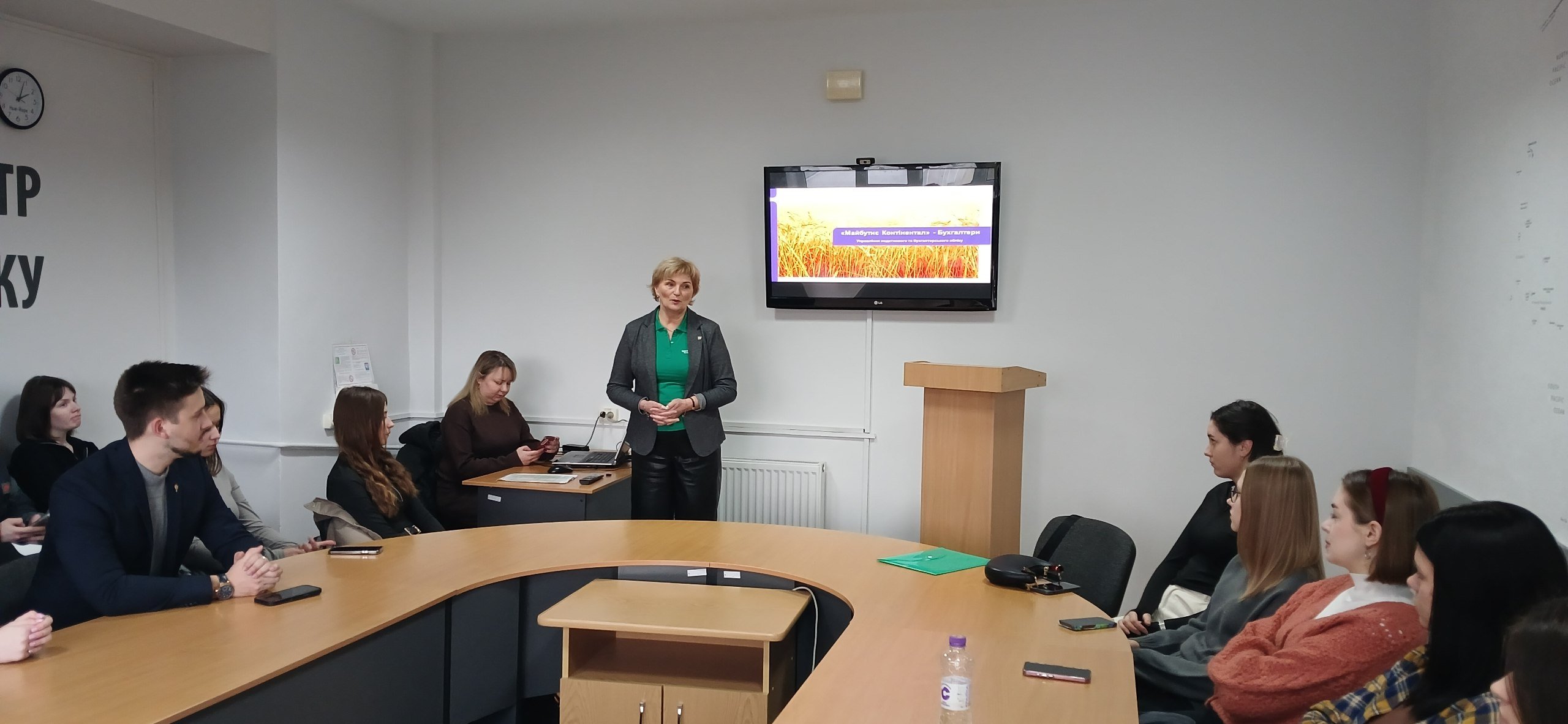 Запрошені фахівці Руслана Скаляк – менеджерка з підбору персоналу та Інна Загурська – проєктна менеджерка, кураторка програми «Майбутнє Контінентал», ознайомили слухачів з актуальними практичними тенденціями податкового та бухгалтерського обліку на підприємствах аграрної сфери в Україні. На гостьовій лекції були присутні студенти, які навчаються за спеціальністю «Фінанси, банківська справа, страхування та фондовий ринок» (освітні програми «Фіскальне адміністрування», «Митна та податкова справа», «Фінанси», «Фінансовий менеджмент», «Банківська справа») та «Облік і оподаткування» (освітня програма «Облік і оподаткування»).