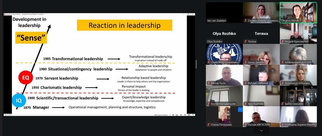Значну увагу лектор приділив також еволюції лідерських парадигм — від інтелектуально орієнтованого управління (IQ) та емоційного лідерства (EQ) до сучасної концепції автентичного лідерства, що базується на духовному інтелекті (SQ), етичних цінностях і моральному авторитеті. Ян ван Звітен зазначив: «Саме модель автентичного лідерства є необхідною передумовою відновлення довіри як на національному, так і на глобальному рівнях».