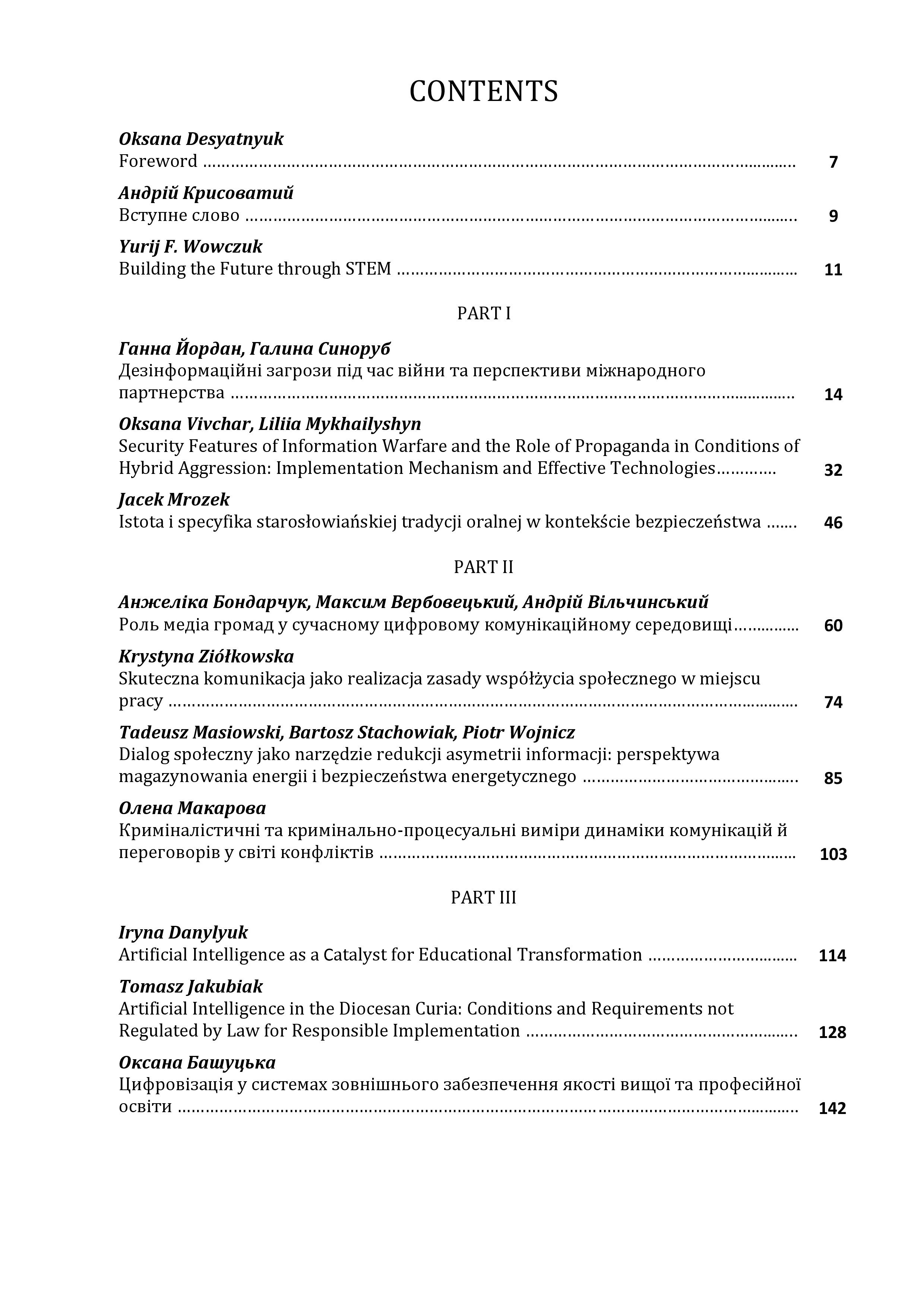 У передмові до монографії ректор Класичного університету Тернополя, професор Оксана Десятнюк наголошує, що в XXI столітті комунікація перестала бути лише інструментом обміну інформацією, перетворившись на визначальний чинник формування довіри, соціальної згуртованості та сталості суспільних систем. В умовах цифровізації, глобальної взаємозалежності та постійних криз саме комунікація визначає моделі взаємодії між людьми, інституціями та державами, відкриваючи шлях до діалогу.