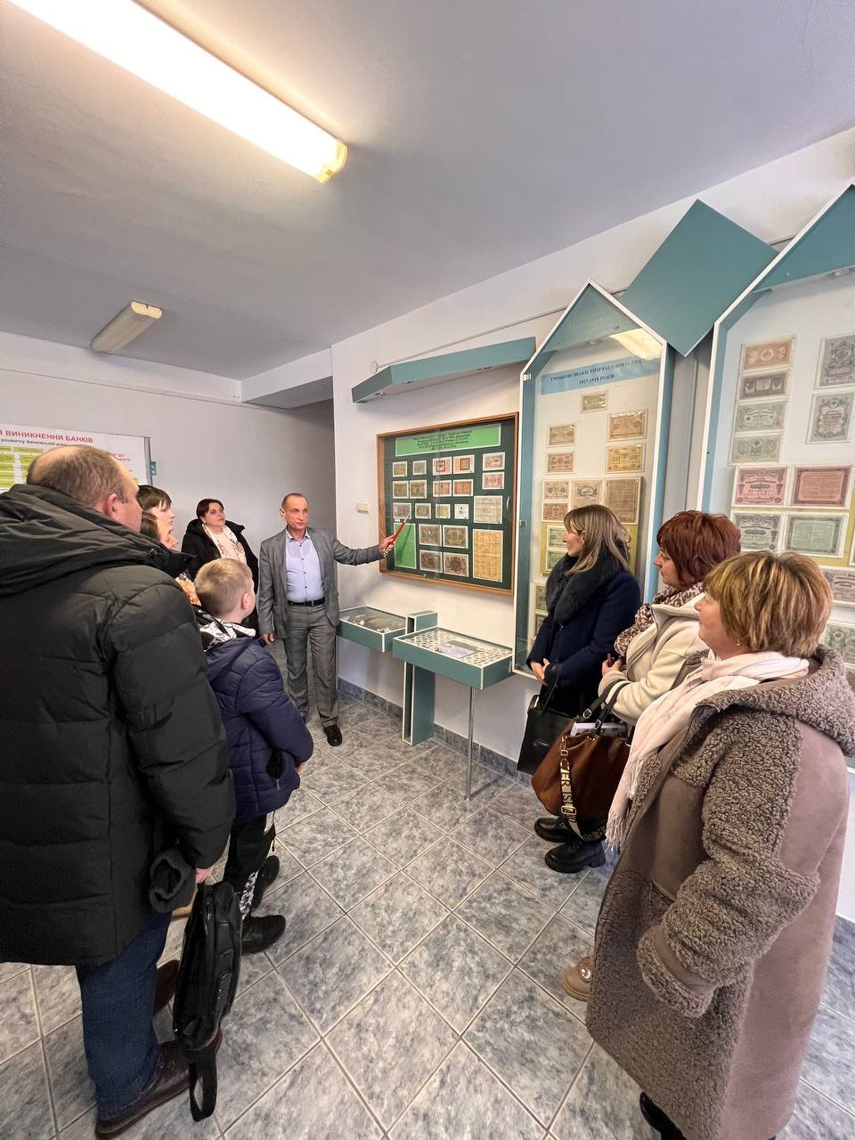 Під час екскурсії до музею історії грошей учні та вчителі дізналися про еволюцію грошового обігу на українських землях — від найдавніших товарних форм обміну та перших монет до сучасних грошових знаків. Відвідувачам представили історію становлення національної валюти — від лічильно-вагових одиниць IX століття та срібних зливків XI–XIII століть, грошей Української Народної Республіки (1917–1920 рр.) і до сучасної гривні.