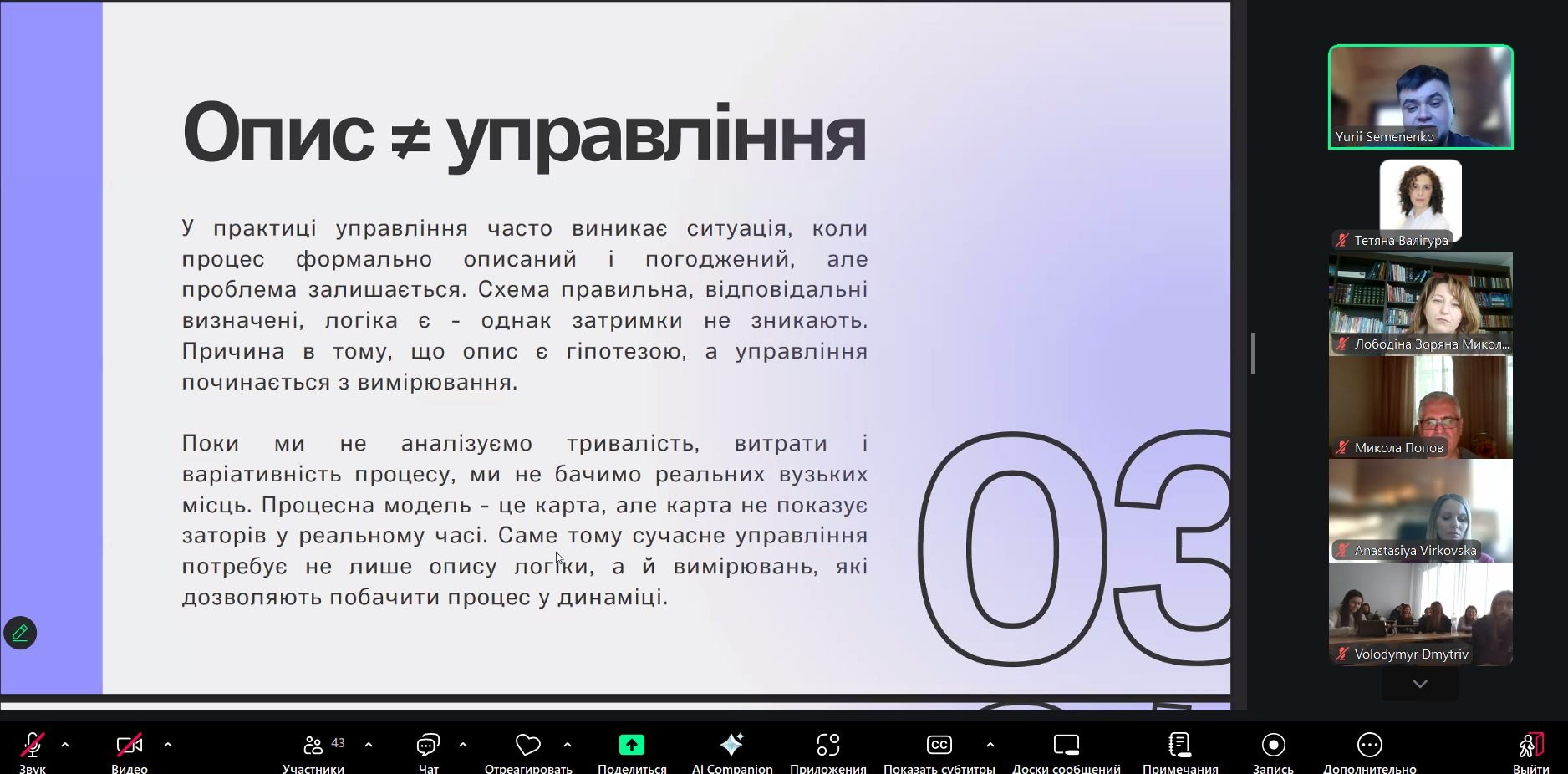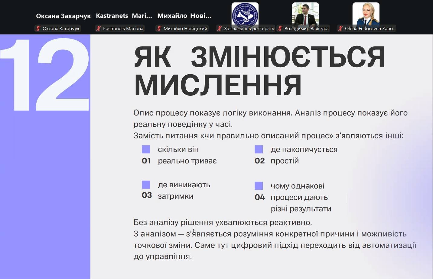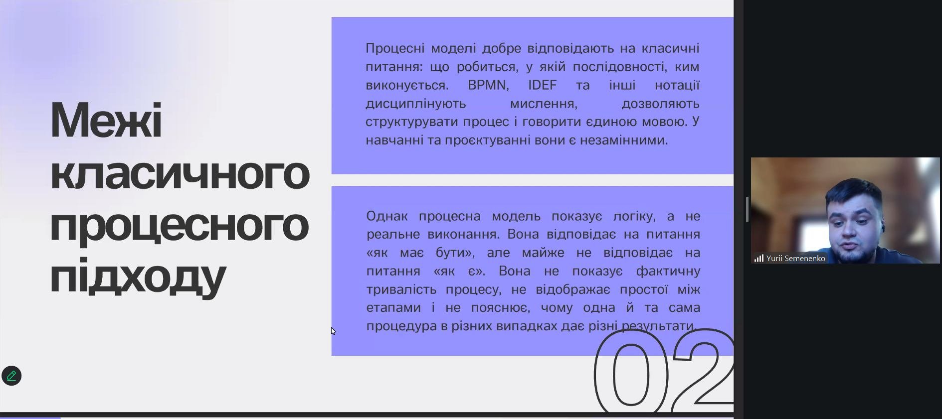 Під час виступу науковець представив сучасне бачення бізнес-процесів як джерела даних для ухвалення обґрунтованих управлінських рішень. Особлива увага приділялася обмеженням класичного процесного підходу та необхідності переходу від простого опису процесів до їх вимірювання й аналізу в динаміці.