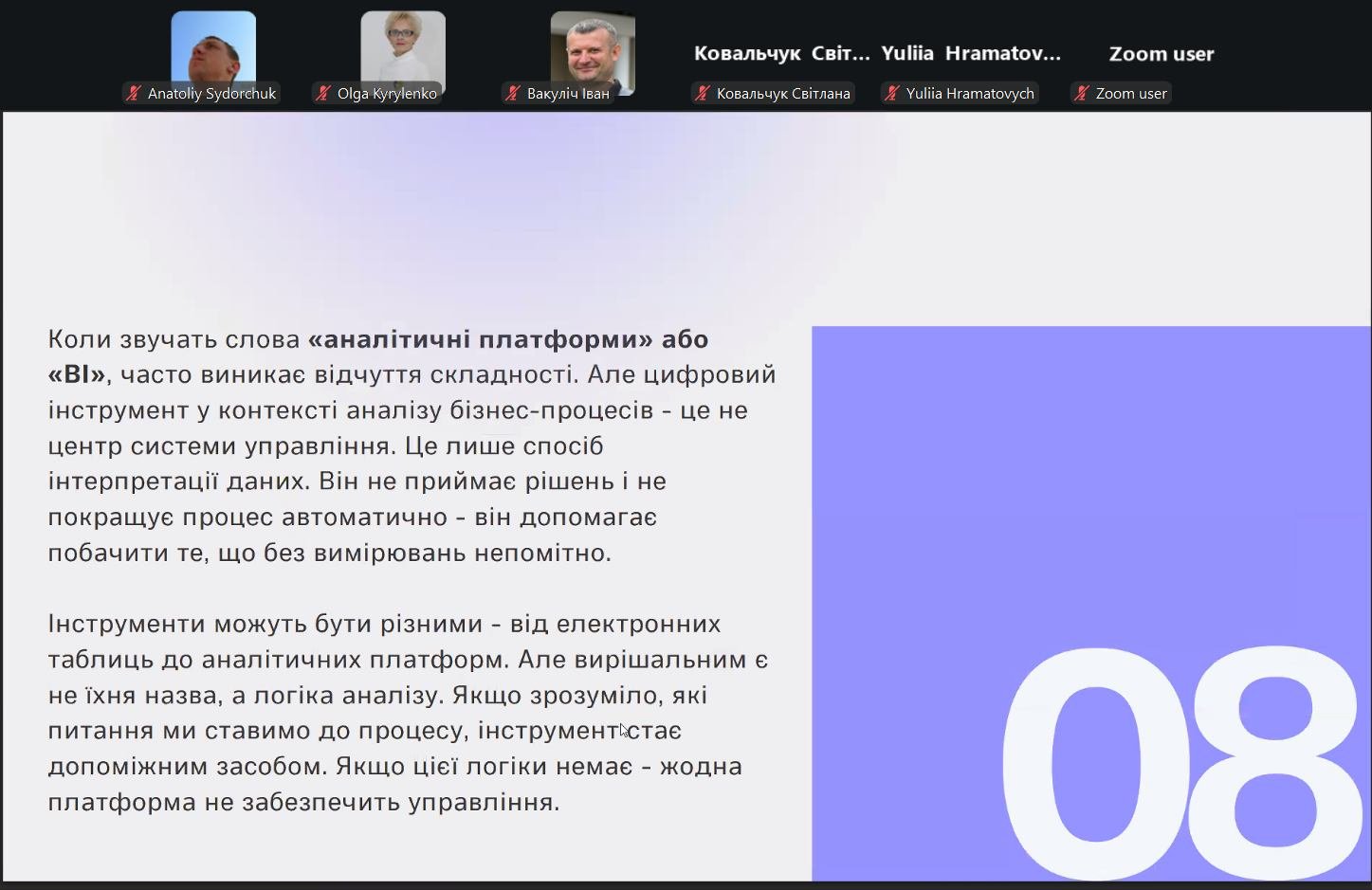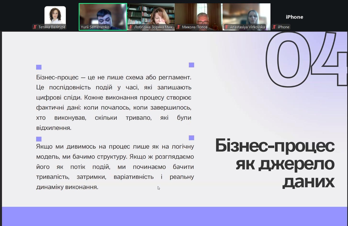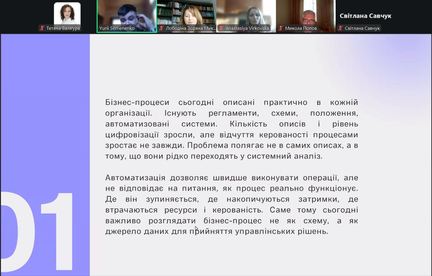 У вебінарі розкрито роль CRM та ERP-систем, аналітичних платформ і електронних таблиць у фіксації, структуризації та інтерпретації процесних даних. Окремо було висвітлено застосування штучного інтелекту для аналізу складних і варіативних бізнес-процесів.