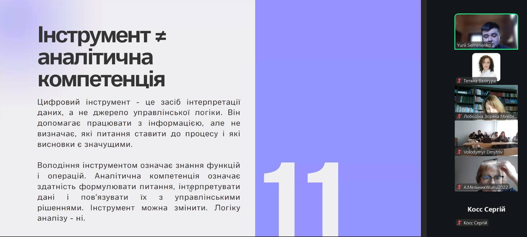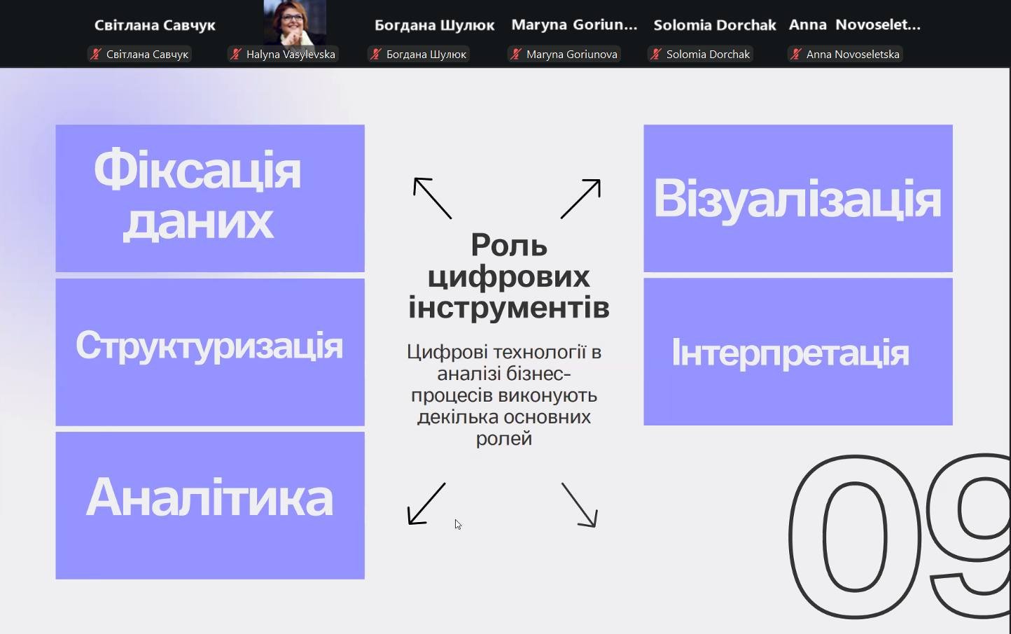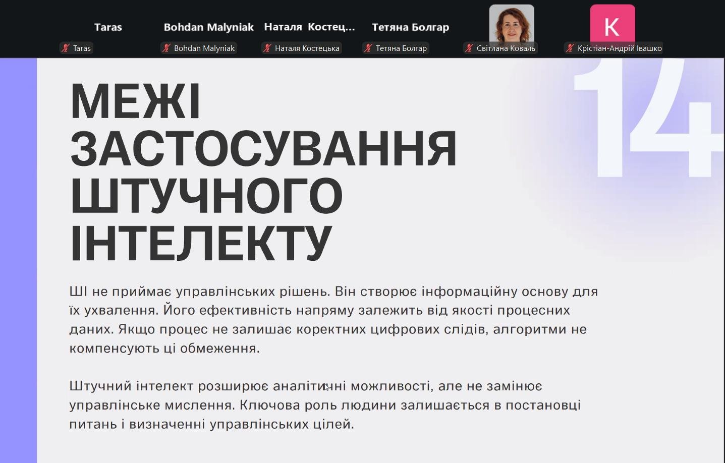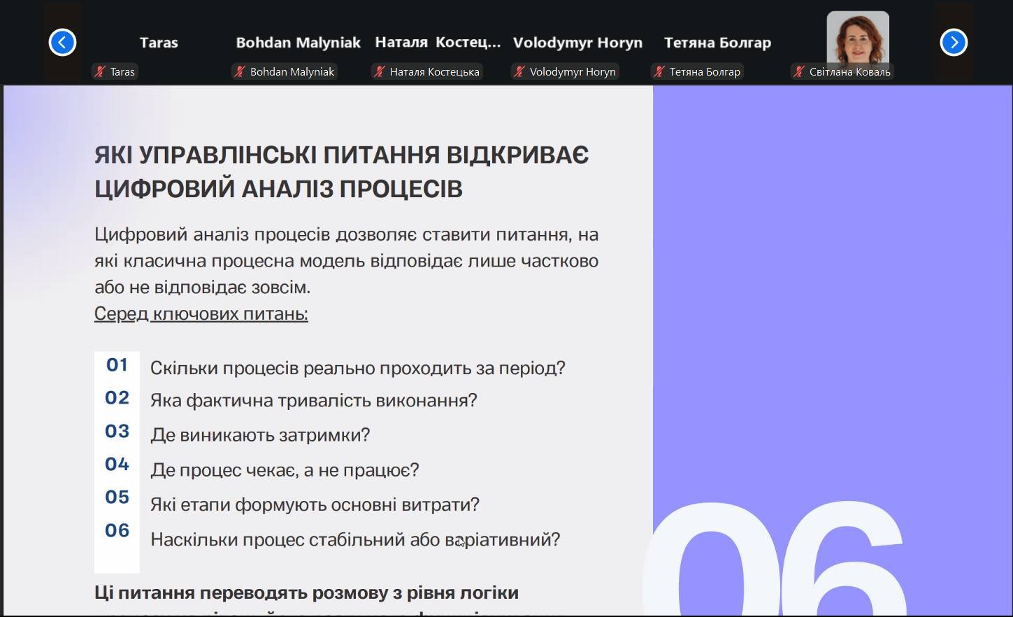 У вебінарі розкрито роль CRM та ERP-систем, аналітичних платформ і електронних таблиць у фіксації, структуризації та інтерпретації процесних даних. Окремо було висвітлено застосування штучного інтелекту для аналізу складних і варіативних бізнес-процесів.