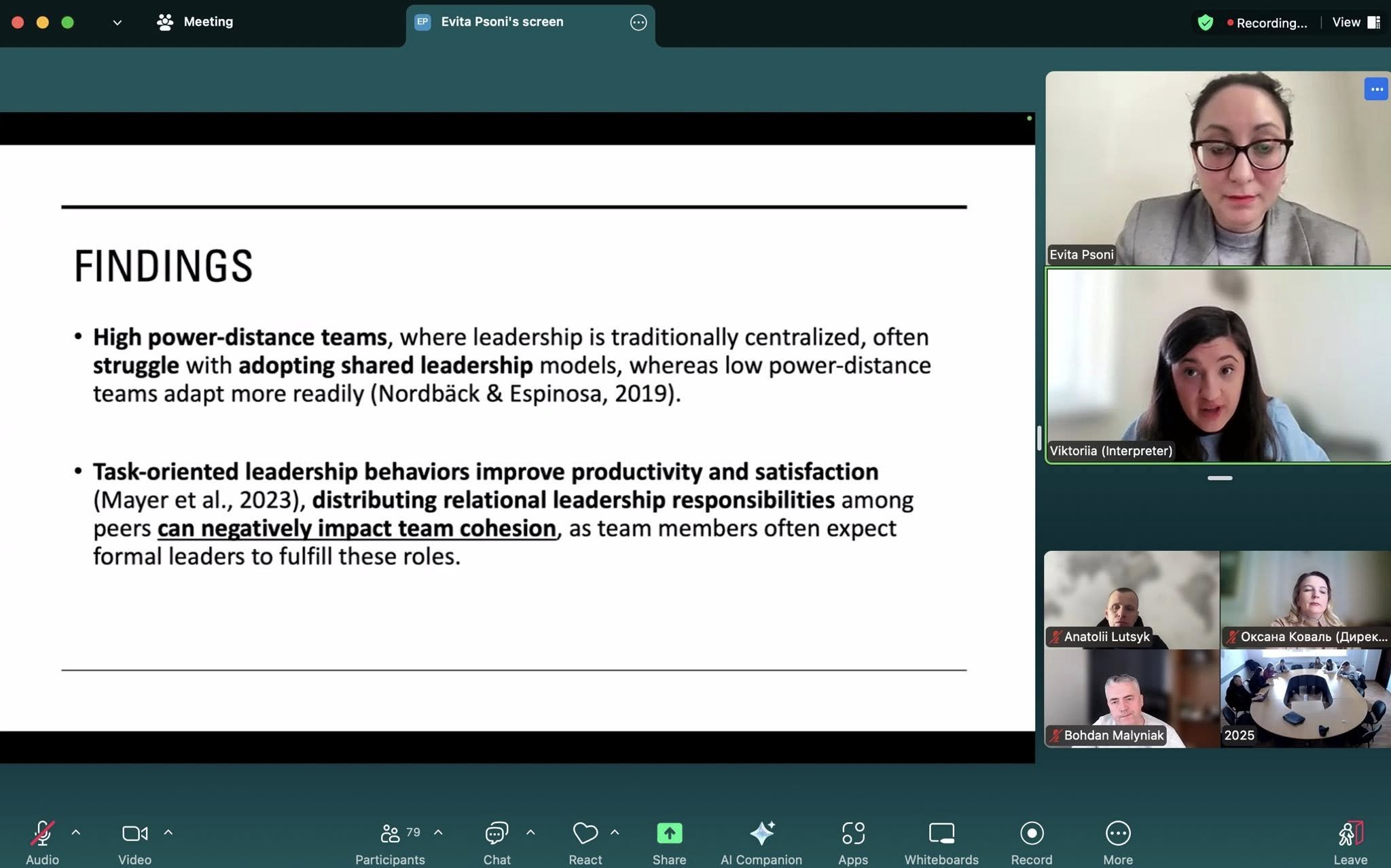 Досліджуючи питання зміни управління бізнесом та колективами у зв’язку із появою штучного інтелекту, лекторка відзначила: «Формальне лідерство в аспекті відносин між членами команди, розподілу обов’язків не було б настільки ефективним у віртуальній командній роботі. Формальне лідерство у віртуальній команді негативно впливає на кінцевий результат. Довіра до учасників у такому середовищі стає одним з важливих елементів ефективної команди». Важливим є збереження координації та контролю всередині колективу, оскільки відсутність чітко вираженого формального лідерства знижує почуття персональної відповідальності.