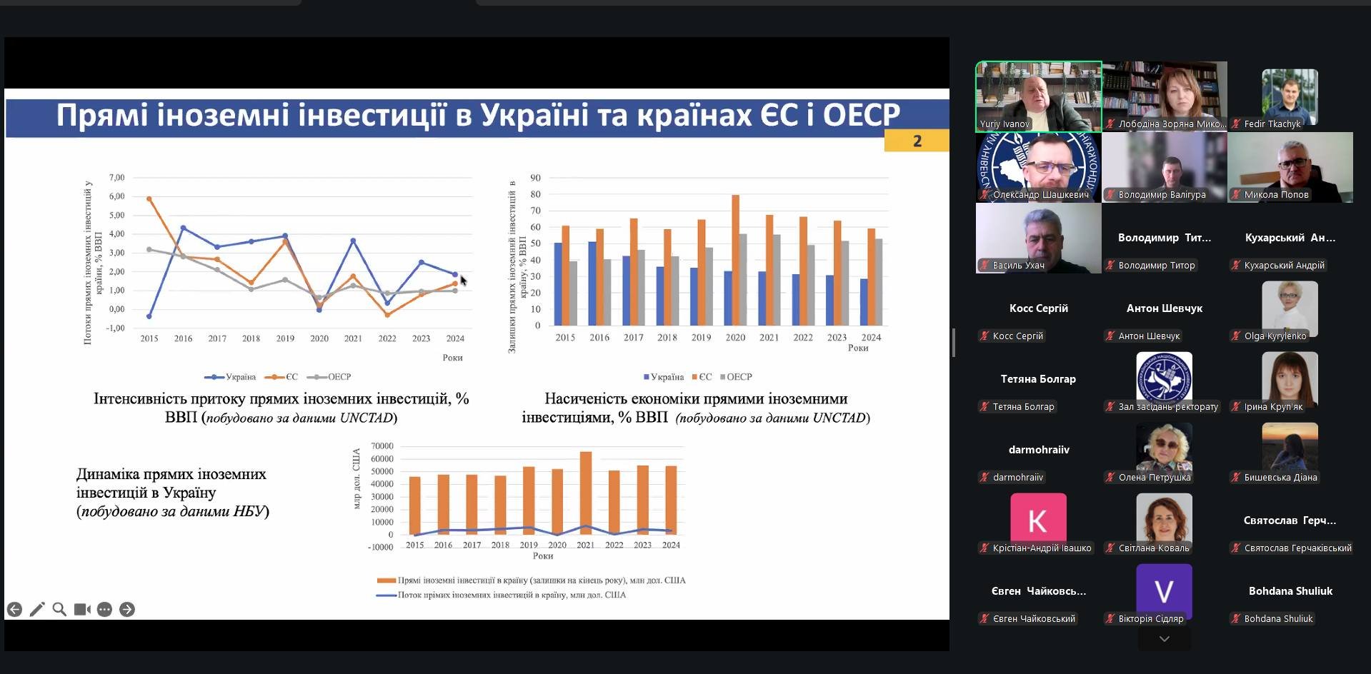 Юрій Іванов детально зупинився на аналізі динаміки прямих іноземних інвестицій в Україну, порівнявши їх із відповідними показниками країн ЄС та ОЕСР. Лектор наголосив, що залучення інвестиційних ресурсів є ключовою передумовою структурної модернізації економіки та підвищення її конкурентоспроможності в умовах глобальних трансформацій.