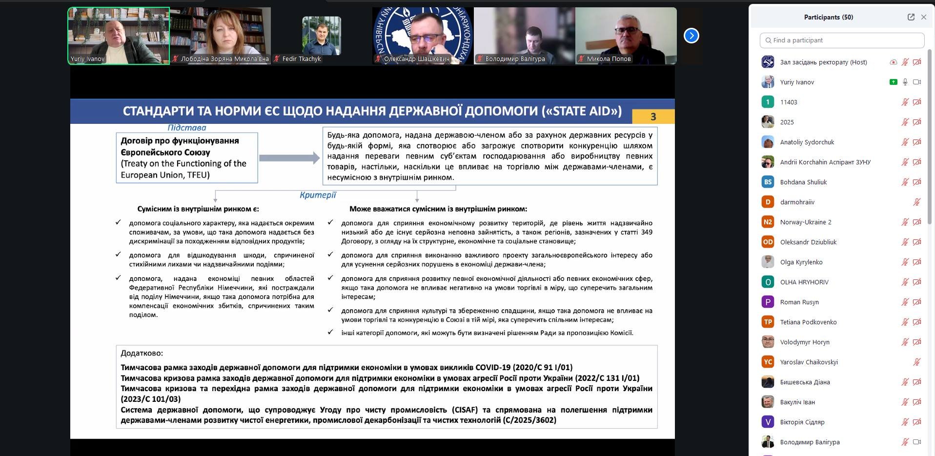 Особливу увагу було приділено європейським стандартам і нормам державної допомоги (в межах роботи напрямів «State Aid»), які визначають критерії сумісності підтримки з правилами внутрішнього ринку та спрямовані на забезпечення прозорості, ефективності та справедливості державної підтримки. Спікер підкреслив, що імплементація цих підходів в Україні є важливим кроком на шляху до гармонізації економічної політики з європейськими принципами та створення сприятливого інвестиційного середовища.