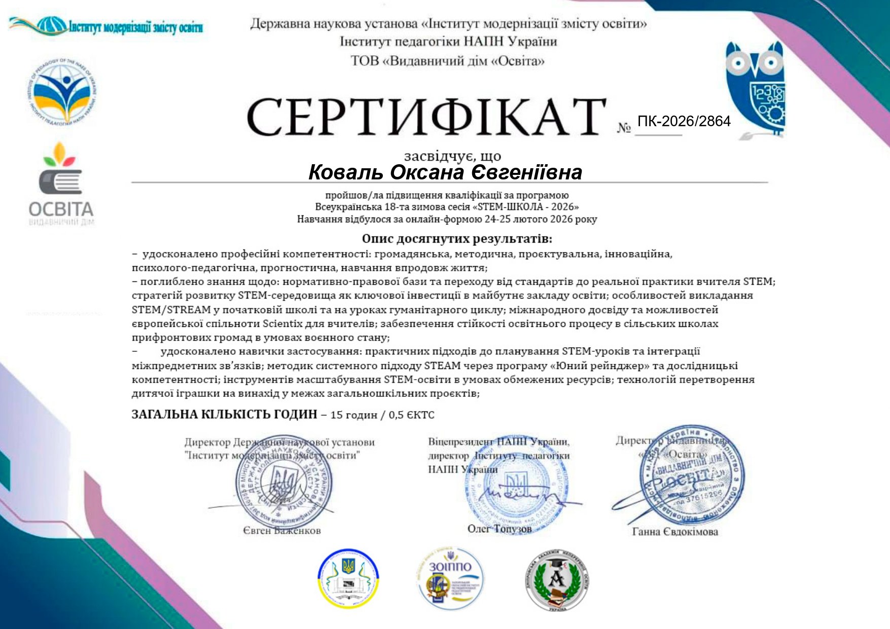 Нещодавно директор навчально-наукового центру комунікацій Західноукраїнського національного університету Оксана Коваль та координатор STEM-лабораторії ЗУНУ Діана Бойко долучилися до роботи 18-ї Всеукраїнської зимової сесії «WEB-STEM-ШКОЛА – 2026», що відбулася 24-25 лютого 2026 року, та отримали сертифікати підвищення кваліфікації.