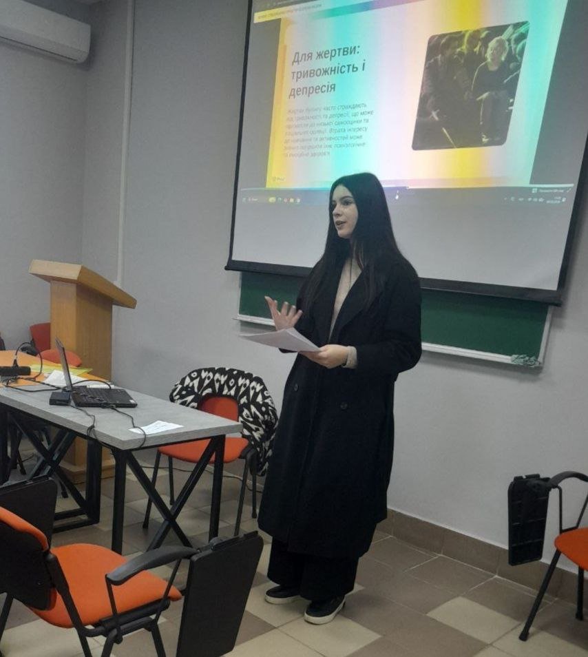 До проведення тренінгу долучилася студентка спеціальності ЕК-11 Пеннер Марія, яка представила результати власного дослідження щодо кібербулінгу. Вона поділилася спостереженнями, фактами та висновками, що допомогли глибше зрозуміти особливості цькування в онлайн-просторі та важливість своєчасного реагування на його прояви.