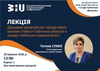 25 березня 2026 року о 13:00 у залі електронних ресурсів (корпус 1) зі студентами та викладачами зустрінеться Голова Державної казначейської служби України Тетяна Слюз. Тема лекції — «Державне казначейство періоду війни: виклики стійкості публічних фінансів в умовах глобальної невизначеності».