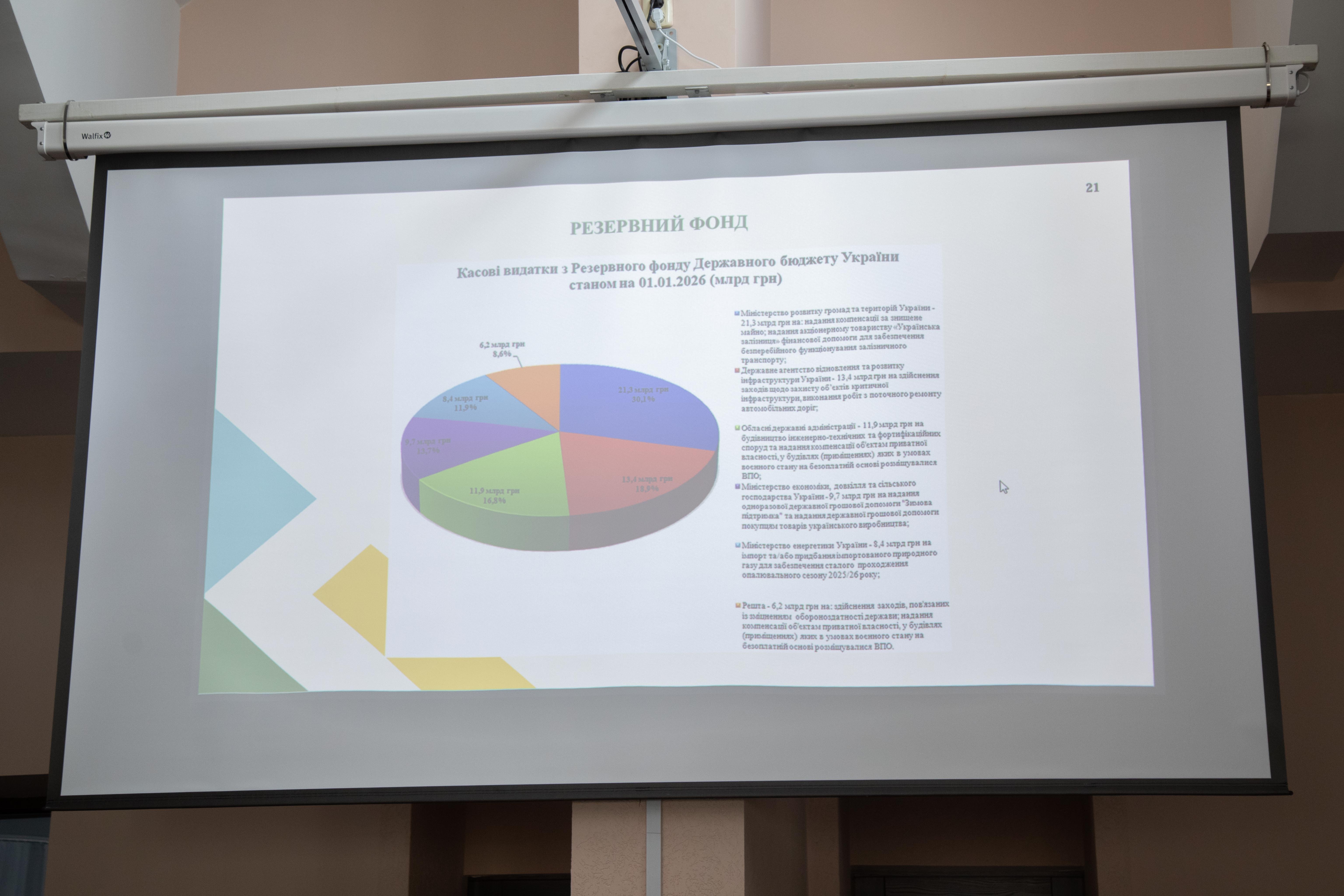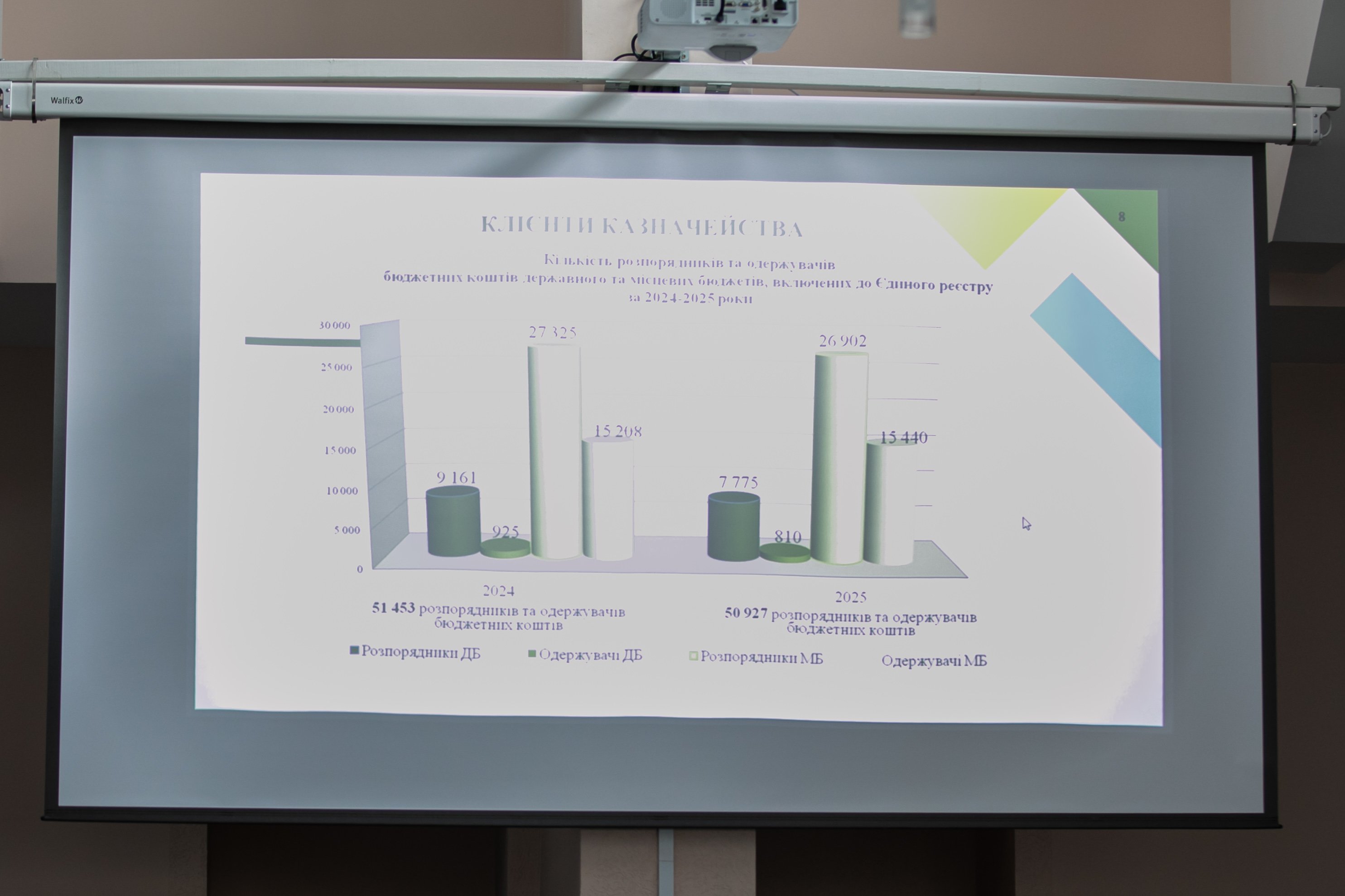 Під час лекції учасники заходу обговорили особливості виконання дохідної частини бюджетів усіх рівнів, включаючи податкові та неподаткові надходження в умовах скорочення економічної активності; механізми та проблеми відшкодування ПДВ, що впливають на ліквідність бізнесу під час війни; стан виконання видаткової частини бюджету з акцентом на пріоритетність оборонних і соціальних витрат; особливості міжбюджетних трансфертів як інструменту підтримки фінансової спроможності регіонів; стан державного та гарантованого державою боргу України, включаючи виклики його обслуговування; практику надання позик з Єдиного казначейського рахунку для покриття тимчасових касових розривів; умови розміщення тимчасово вільних коштів місцевих бюджетів через придбання державних цінних паперів; виконання судових рішень органами казначейства в умовах обмежених бюджетних ресурсів; функціонування системи дистанційного обслуговування «Клієнт казначейства – Казначейство» як інструменту цифровізації; соціальні ініціативи казначейства, спрямовані на підвищення довіри та підтримку громадян.