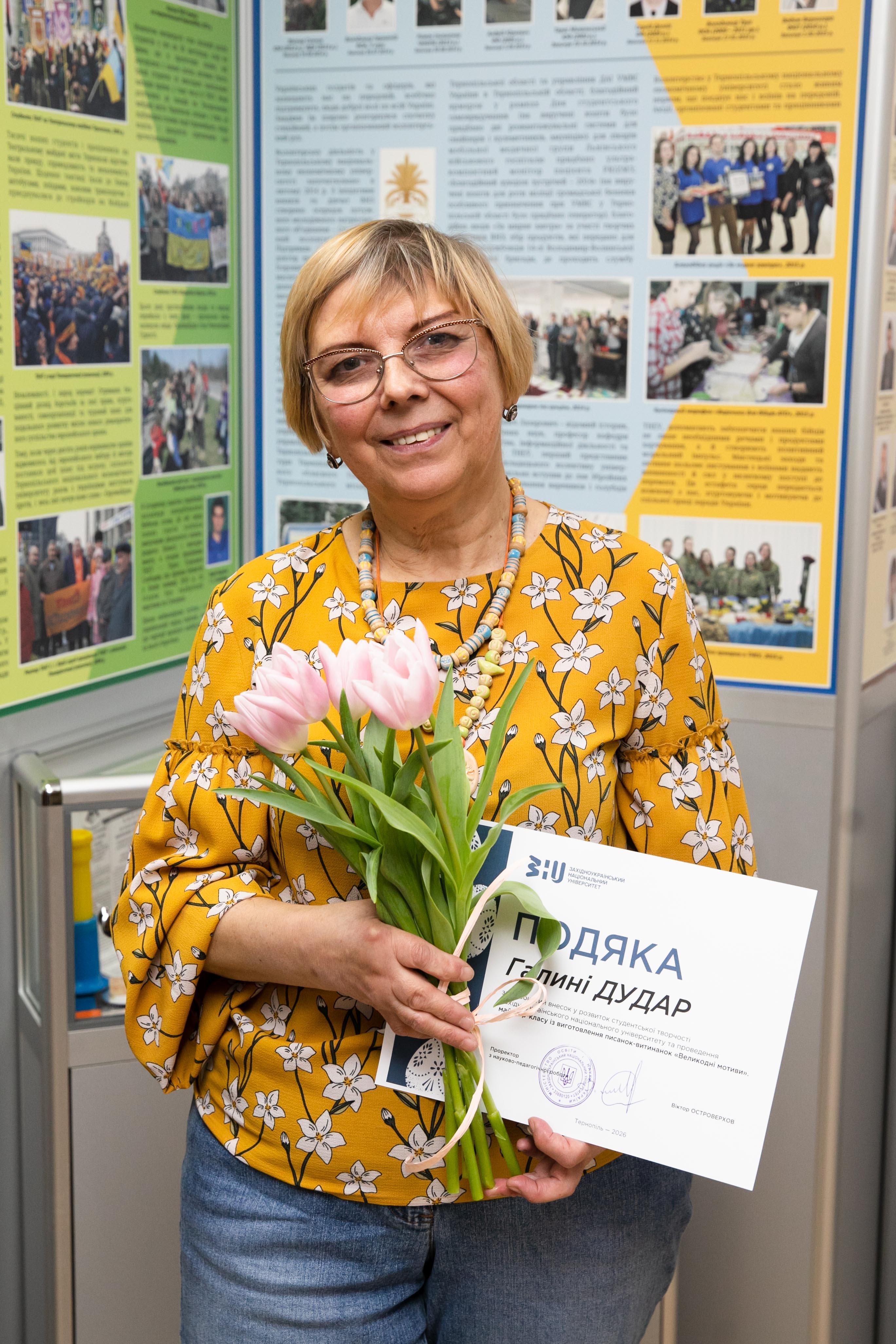 Галині Михайлівні Дудар урочисто вручили подяку адміністрації ЗУНУ та ніжні весняні квіти як знак щирої вдячності за підтримку талановитої молоді університету.