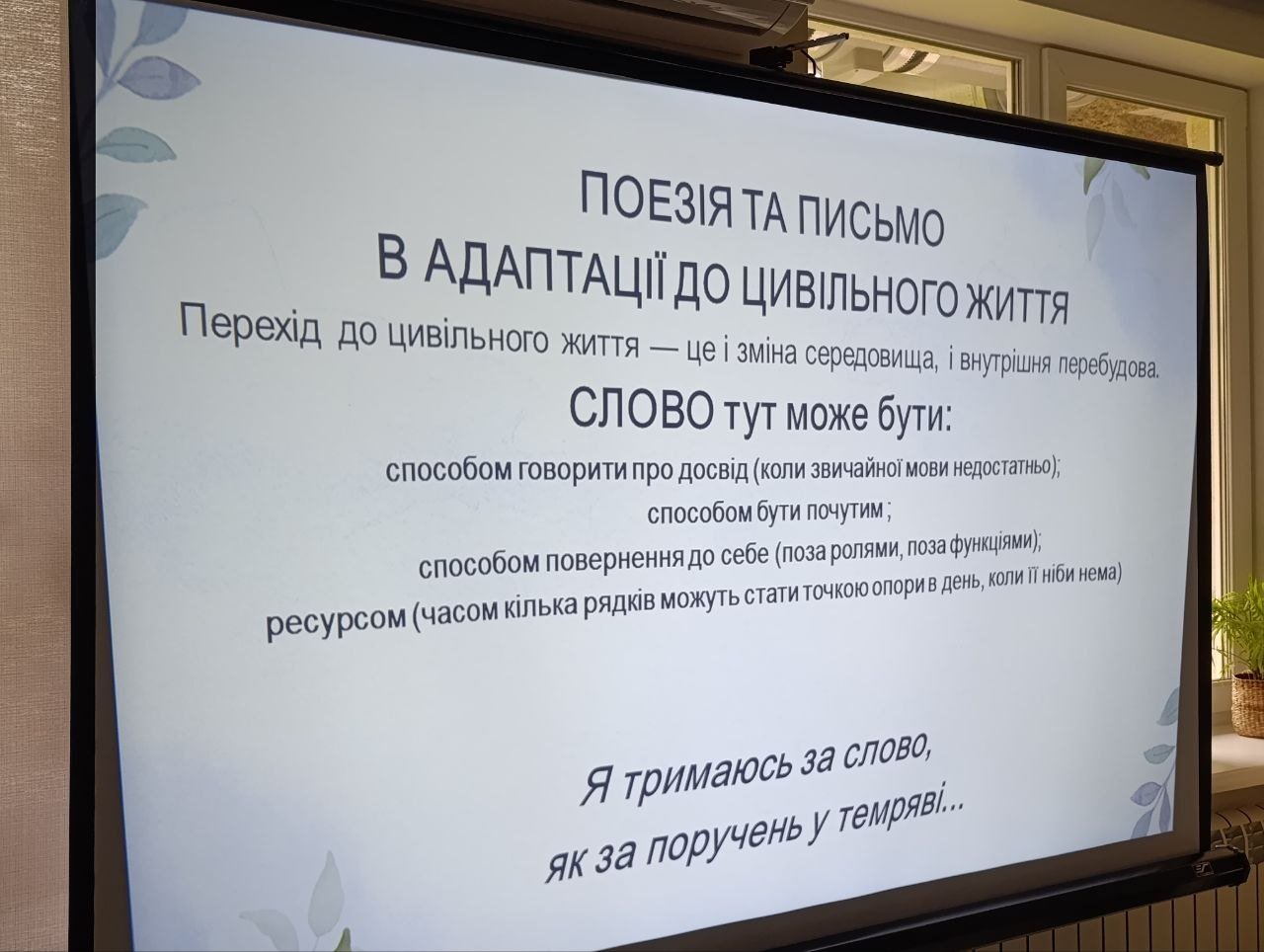 Фахівець центру Ірина Скасків виступила з доповіддю «Рими стійкості: поезія як терапія», у якій висвітлила терапевтичний потенціал поезії як інструменту осмислення травматичного досвіду, емоційної підтримки та пошуку нових сенсів.