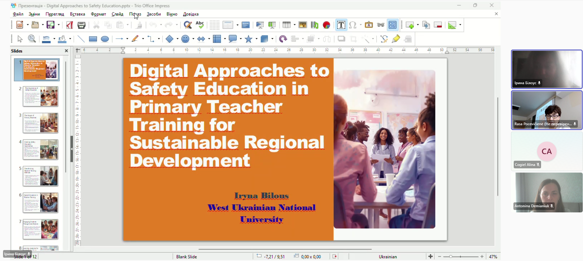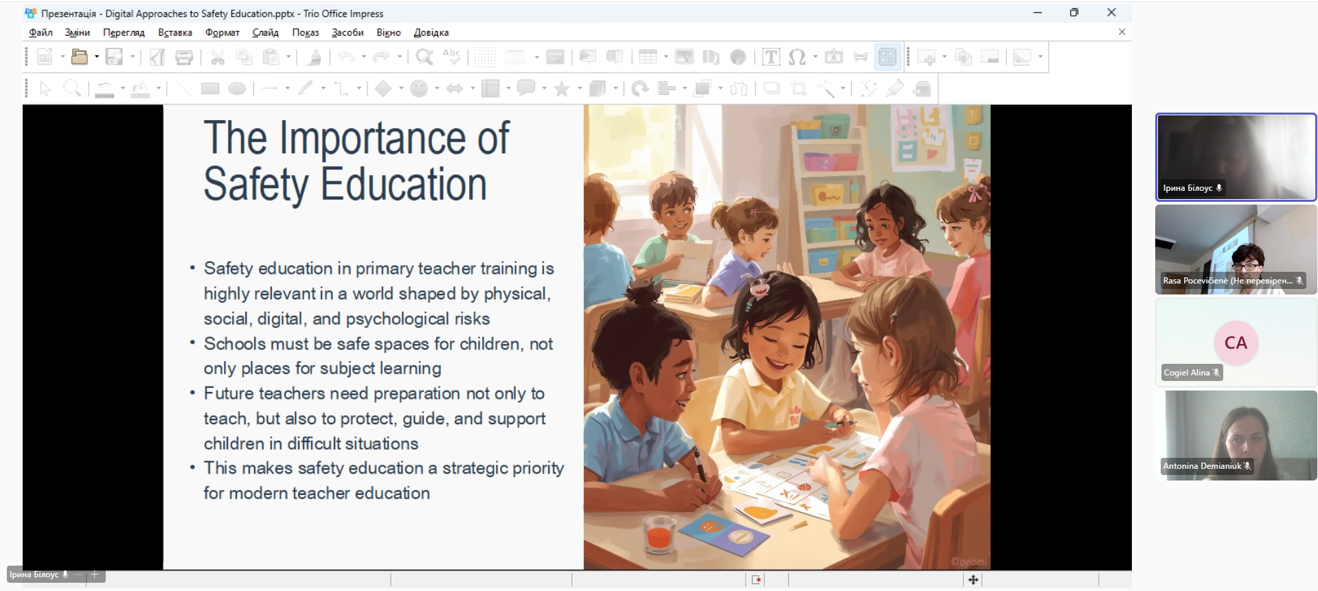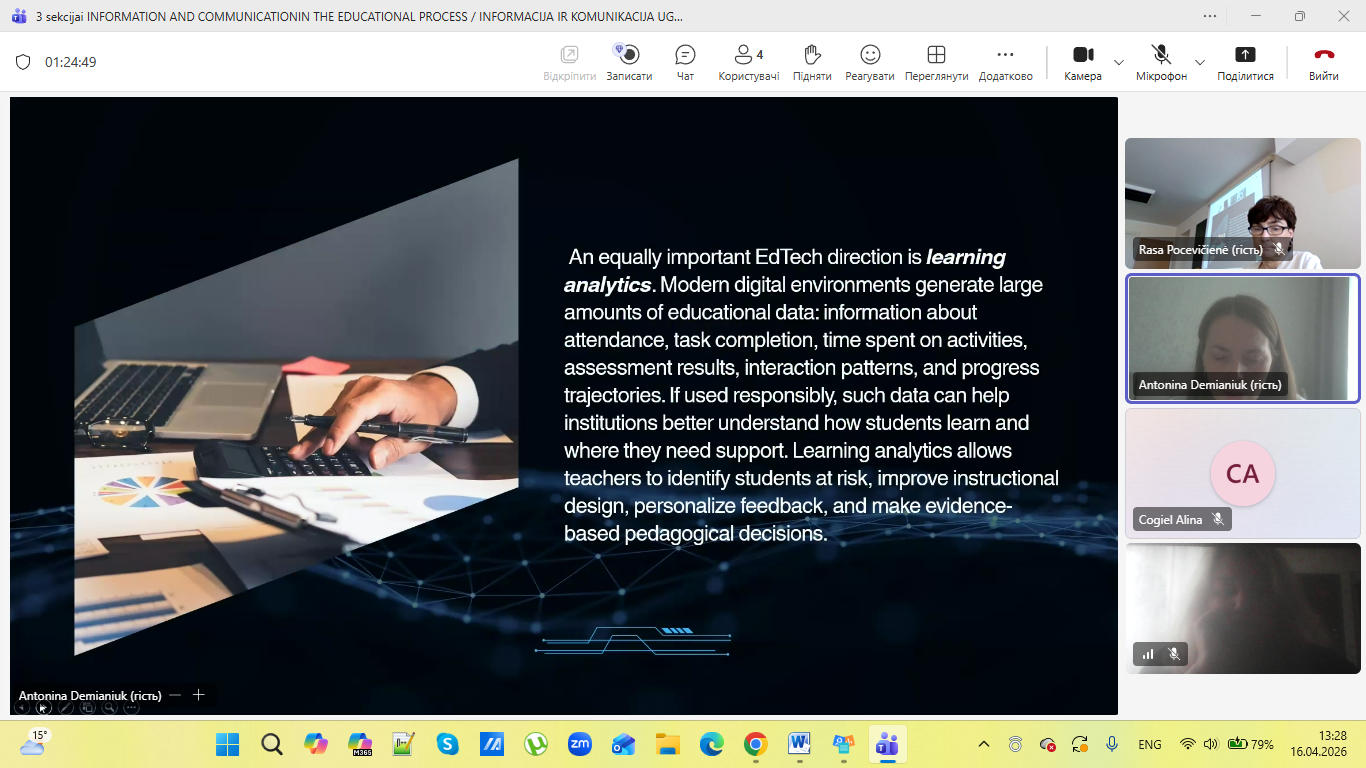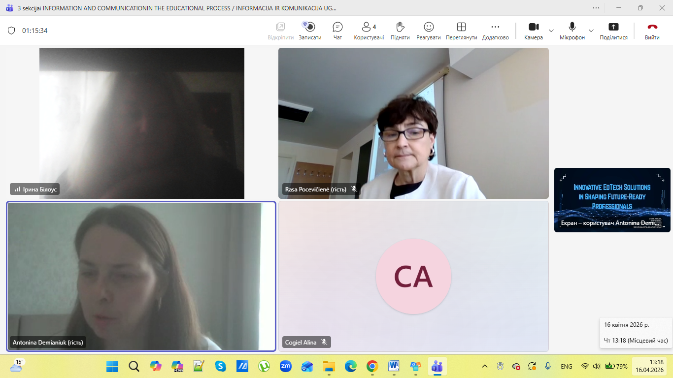 У межах секційного засідання “Information and Communication in the Educational Process” науково-педагогічні працівниці університету представили результати власних наукових досліджень, присвячених актуальним проблемам модернізації освіти в умовах цифрових трансформацій. Зокрема, доцентка Антоніна Дем'янюк виступила з доповіддю “Innovative EdTech Solutions in Shaping Future-Ready Professionals”, у якій висвітлила потенціал інноваційних освітніх технологій у підготовці конкурентоспроможних фахівців, готових до професійної діяльності в сучасному динамічному середовищі. Доцентка Ірина Білоус презентувала доповідь “Digital Approaches to Safety Education in Primary Teacher Training for Sustainable Regional Development”, зосередивши увагу на цифрових підходах до формування безпекової компетентності майбутніх учителів початкової освіти в контексті сталого регіонального розвитку.