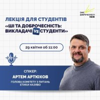 Спікер - Артем Артюхов, голова Комітету з питань етики Національного агентства із забезпечення якості вищої освіти, голова Українського офісу дослідницької доброчесності. Лекція відбудеться 29 квітня 2026 року об 11:00 год у форматі онлайн.