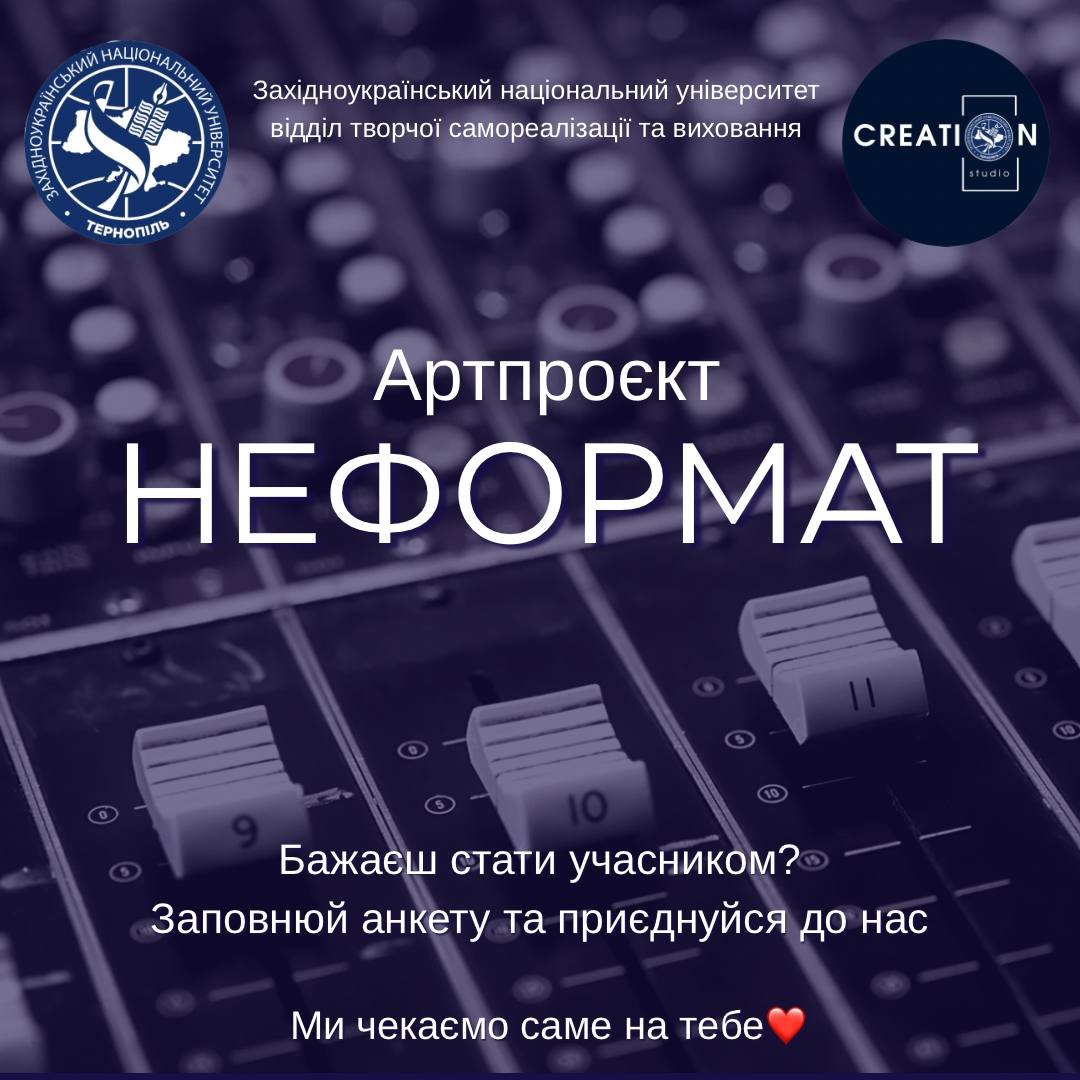 Раді повідомити, що колектив відділу творчої самореалізації та виховання розпочинає підготовку до артпроєкту «НеФормат», який відбудеться 19 листопада в класичному університеті Тернополя.
