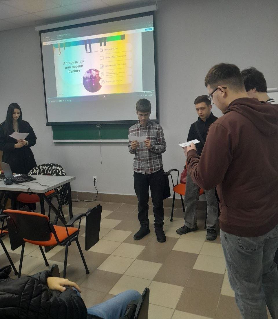 До проведення тренінгу долучилася студентка спеціальності ЕК-11 Пеннер Марія, яка представила результати власного дослідження щодо кібербулінгу. Вона поділилася спостереженнями, фактами та висновками, що допомогли глибше зрозуміти, як проявляється цькування в онлайн-просторі та чому так важливо вчасно реагувати.